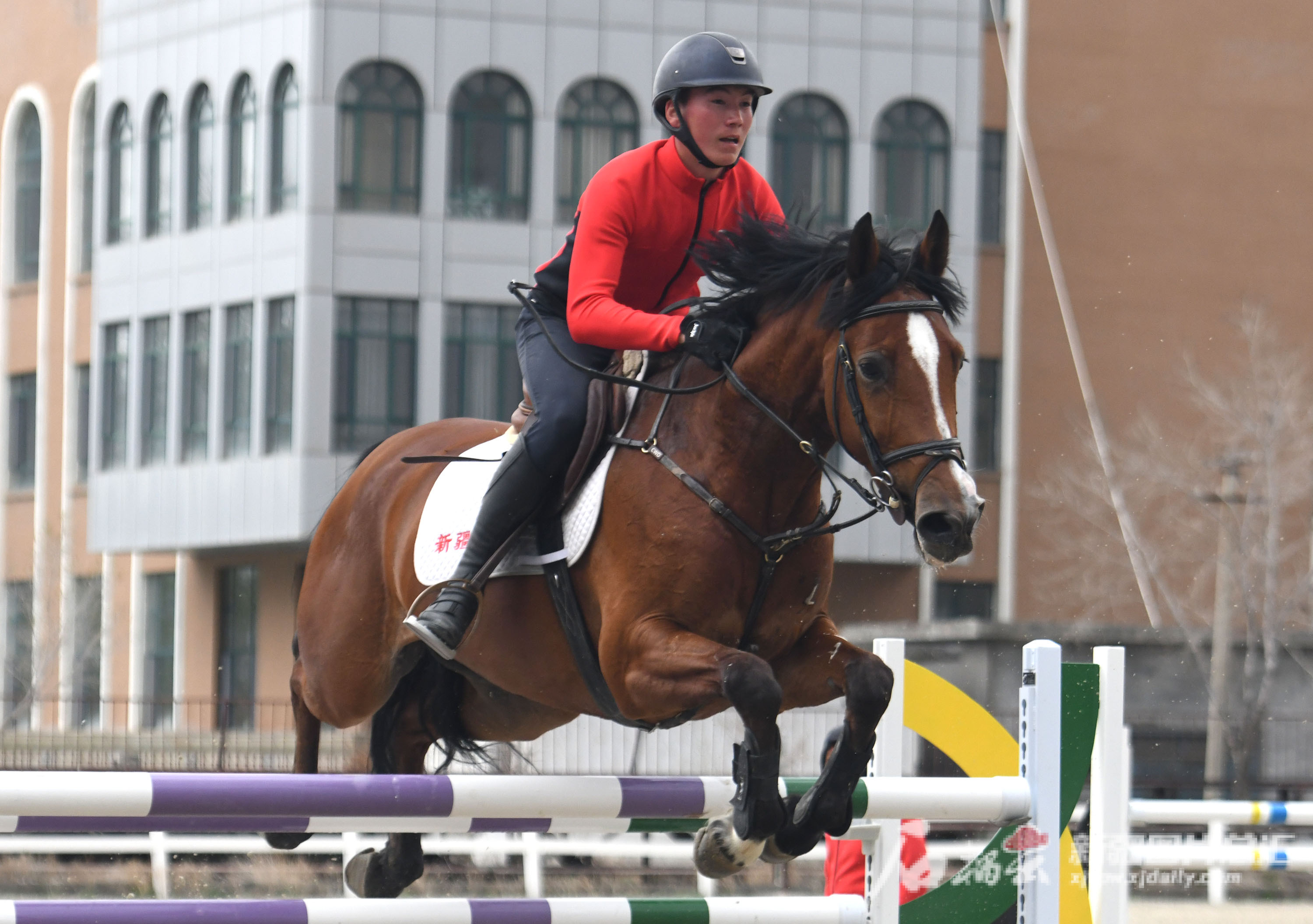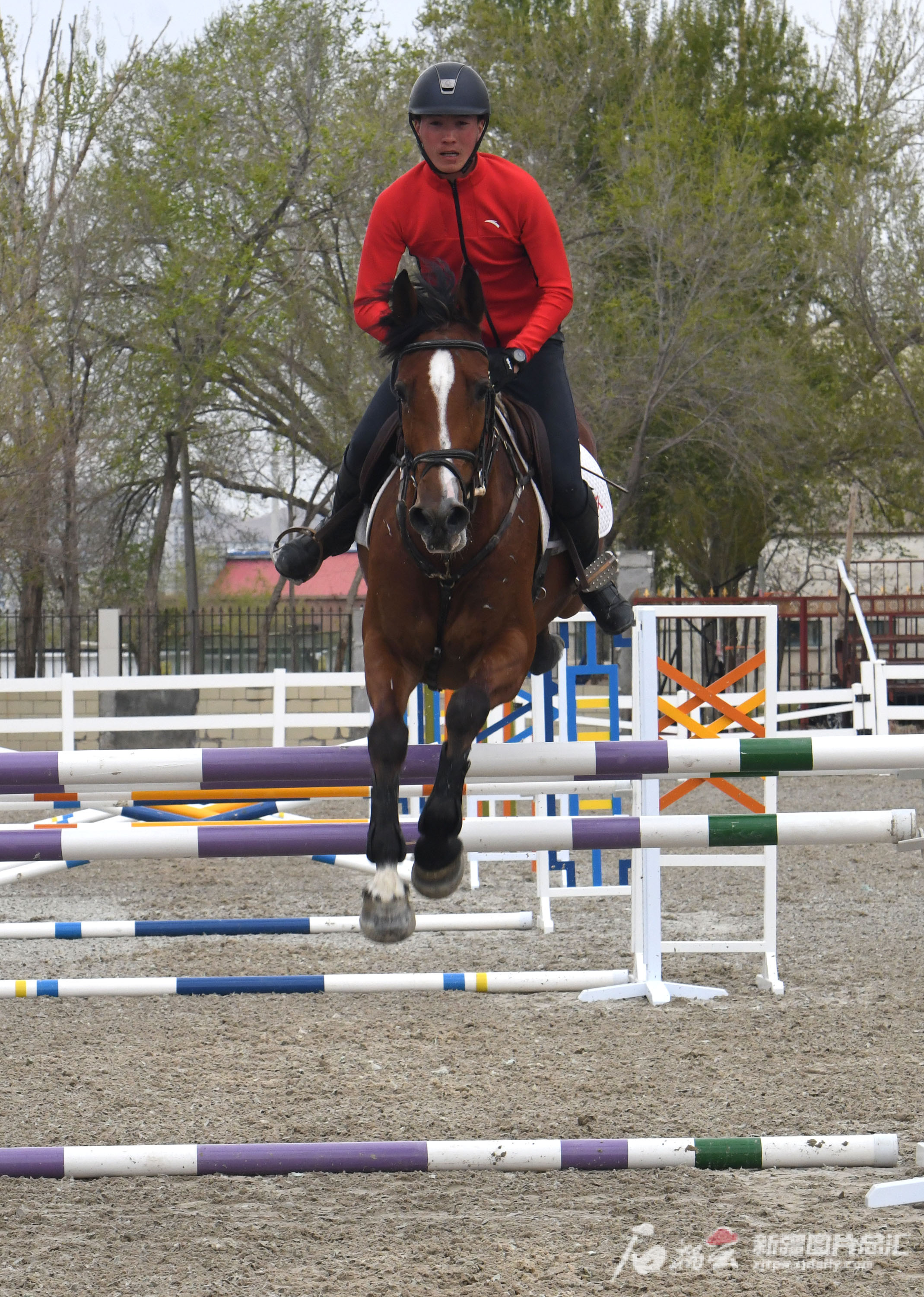 4月25日,在自治區(qū)體育局體育訓練二大隊馬術(shù)訓練場,運動員在進行場地障礙項目表演。天山網(wǎng)-新疆日報記者 張新軍攝