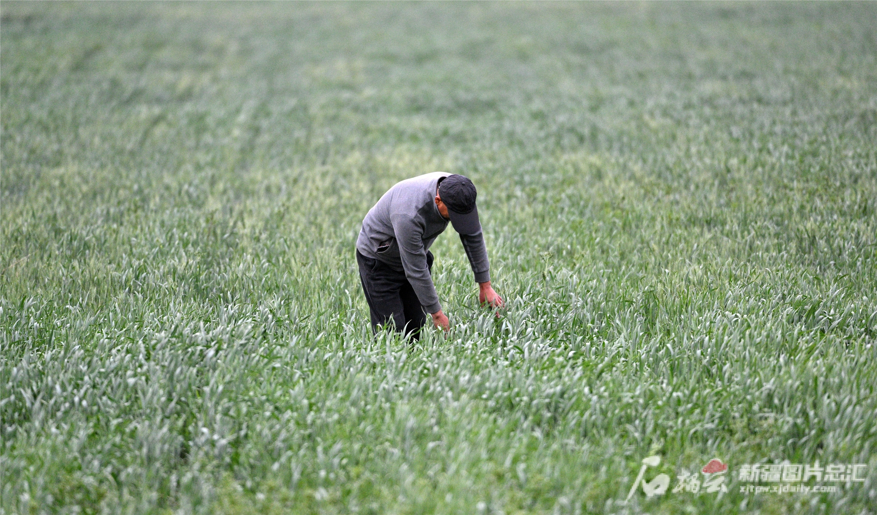 5月21日,庫(kù)爾勒市哈拉玉宮鄉(xiāng)巴格吉代村農(nóng)民在麥田里檢查麥苗長(zhǎng)勢(shì)。確·胡熱攝
