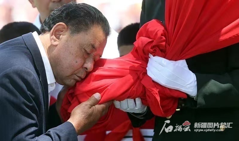 2021年6月1日,沙勒克江·依明親吻國旗護(hù)衛(wèi)隊(duì)?wèi)?zhàn)士手中的國旗。當(dāng)日,塔城市新城街道哈爾墩社區(qū)居民沙勒克江·依明一家受邀來到北京天安門廣場參加升國旗儀式,并與國旗護(hù)衛(wèi)隊(duì)開展互動(dòng)交流。天山網(wǎng)-新疆日報(bào)記者李瑞攝