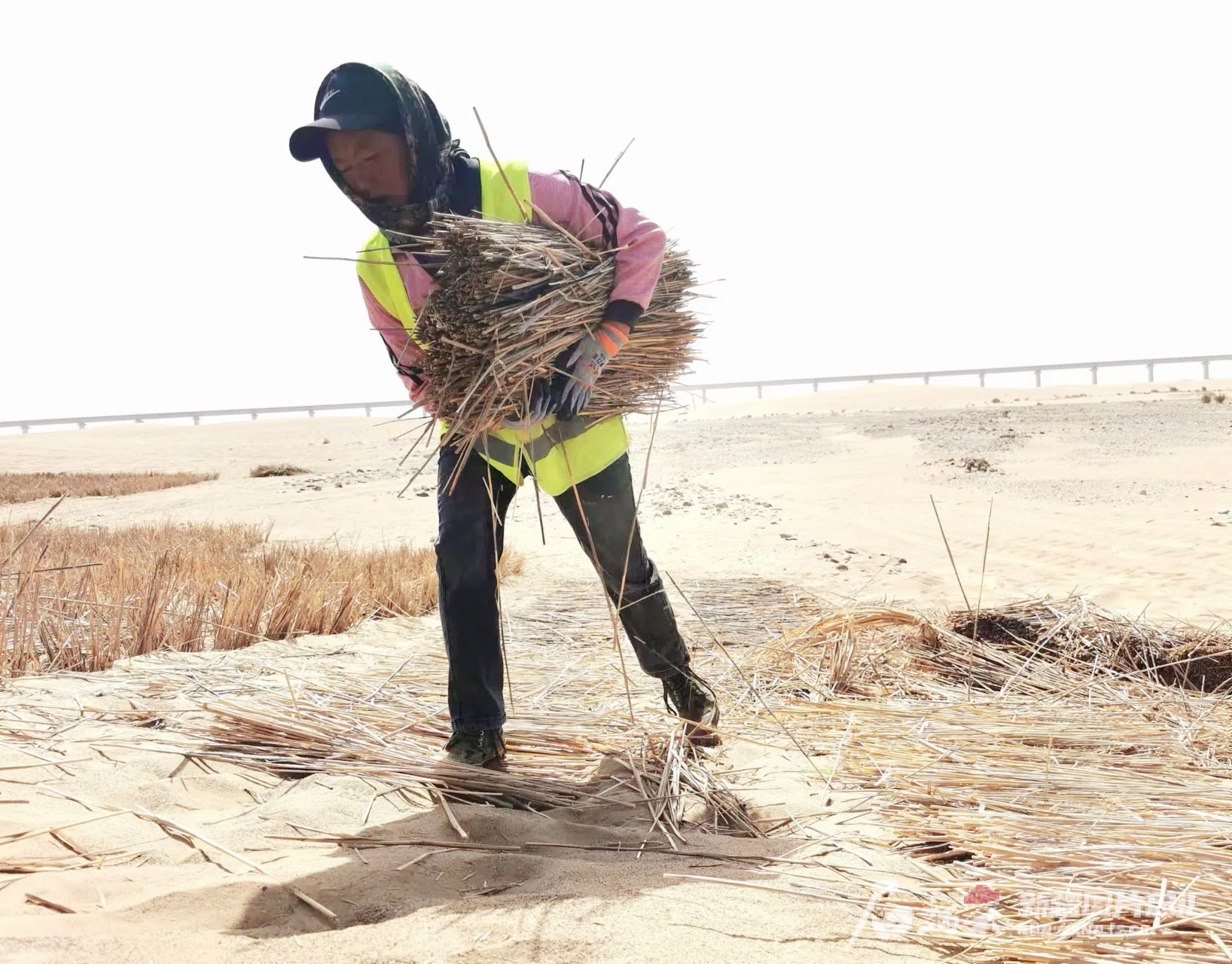 9月6日,工地工人正在將蘆葦稈鋪在沙地上。天山網(wǎng)-新疆日?qǐng)?bào)記者 曹華攝