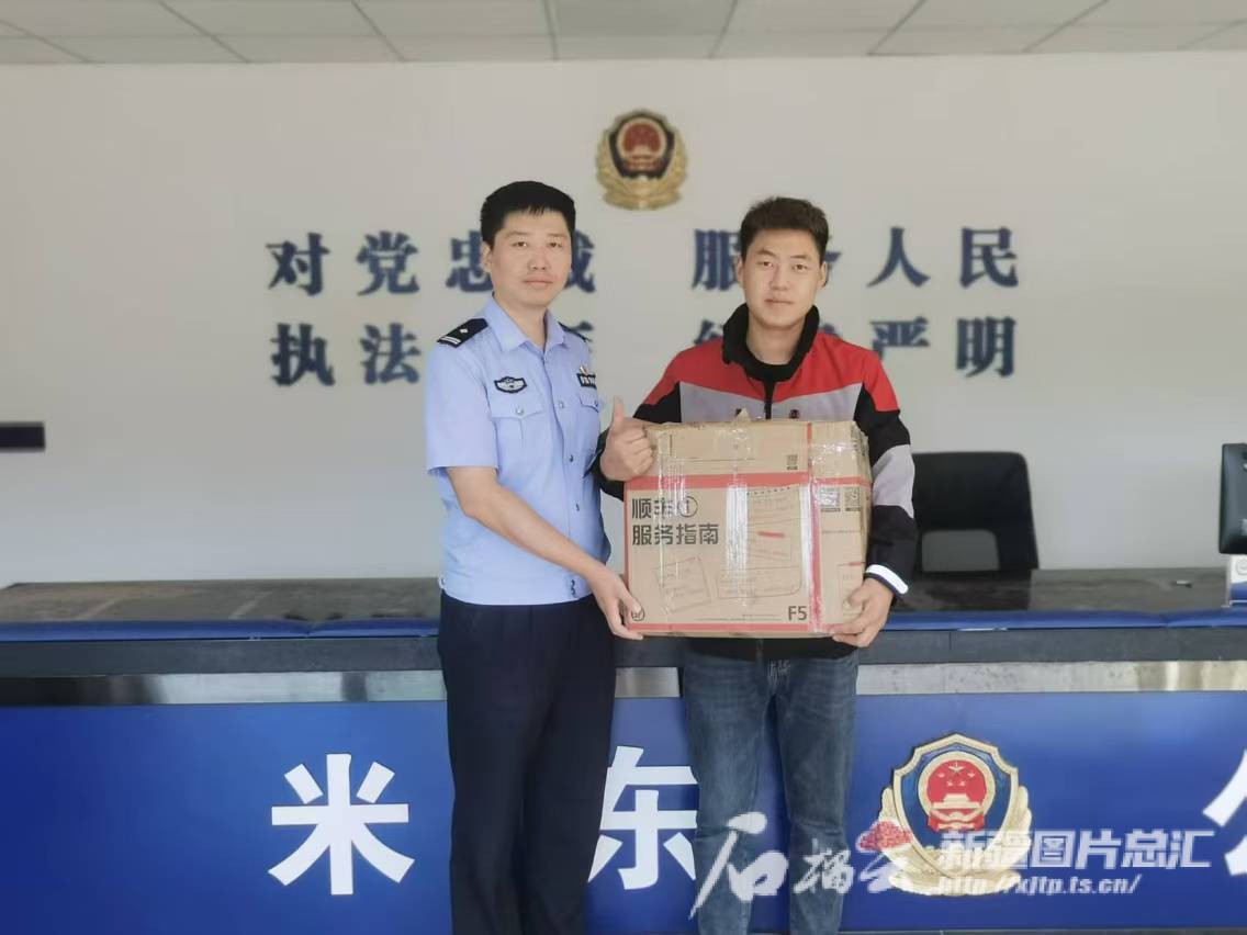 9月15日,快遞員王先生為民警點贊。烏魯木齊市公安局米東區(qū)分局供圖
