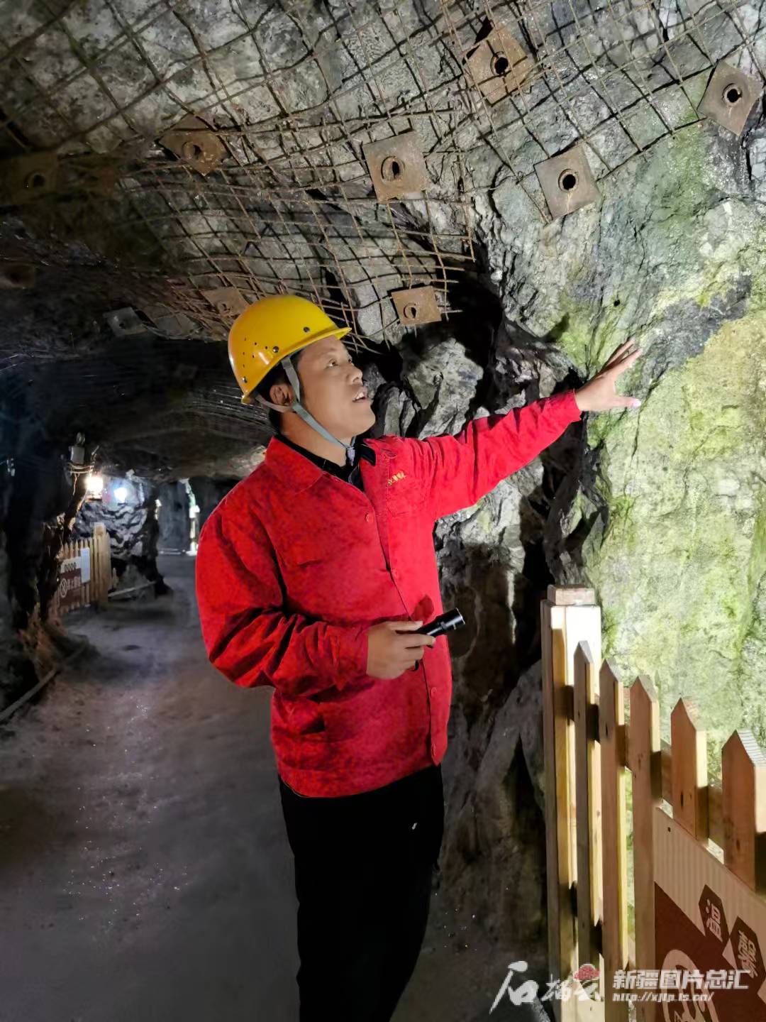 9月18日,可可托海的“礦三代”、可可托海國家礦山公園景區(qū)經(jīng)理譚勝利在阿依果孜礦洞內給游客講解當年發(fā)現(xiàn)的各類礦物。天山網(wǎng)-新疆日報記者 魏永貴攝