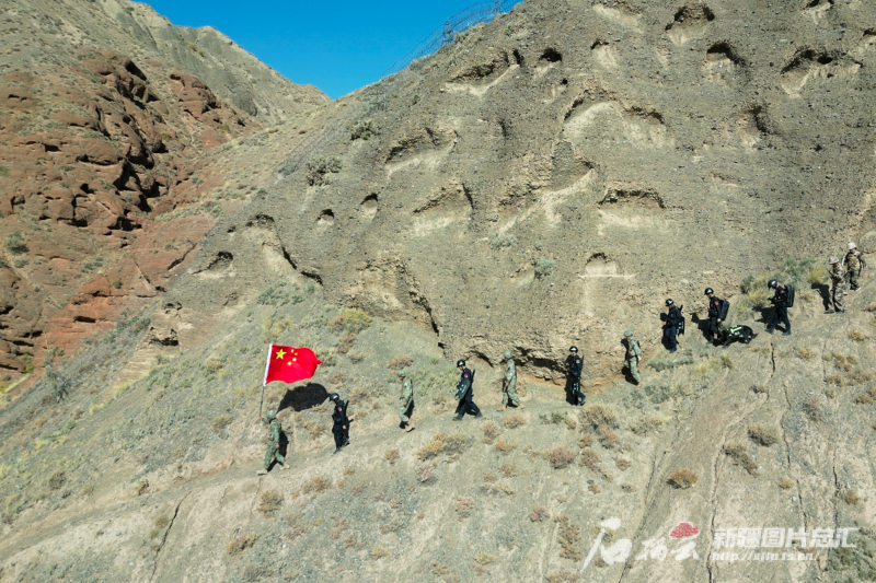 國慶假期,護(hù)邊員們跟隨新疆出入境邊檢總站克州邊境管理支隊(duì)吉根邊境派出所和邊防某部隊(duì)一起在中吉邊境線上巡邊。孔志勇 攝