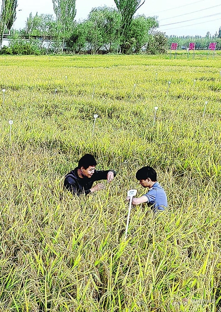 9月29日,工作人員在喀什市帕哈太克里鄉(xiāng)中農(nóng)海稻喀什科研試驗(yàn)基地查看水稻長(zhǎng)勢(shì)。今年,喀什市海水稻種植面積達(dá)1.3萬(wàn)多畝。