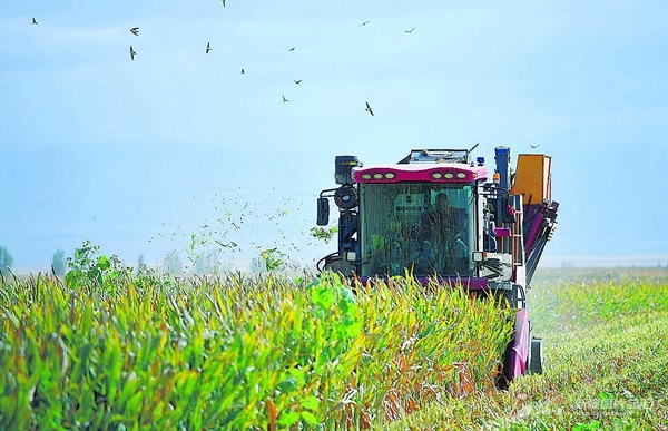 9月26日,農(nóng)民駕駛玉米收割機(jī)在察布查爾錫伯自治縣愛(ài)新舍里鎮(zhèn)安巴帖村收割制種玉米。目前,該鎮(zhèn)已形成了玉米規(guī)模化種植、加工、倉(cāng)儲(chǔ)物流、營(yíng)銷(xiāo)全產(chǎn)業(yè)鏈體系。