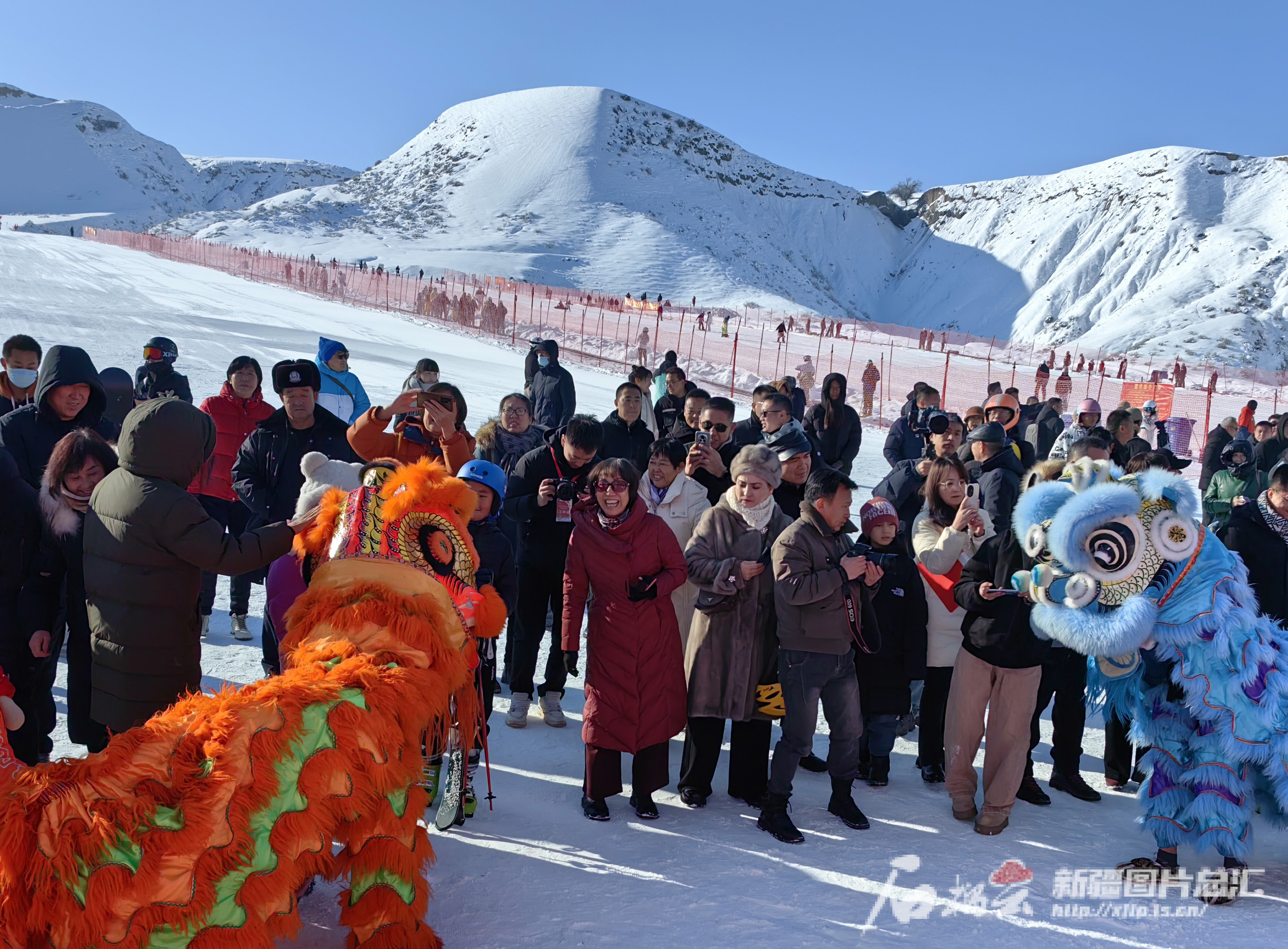 1月11日,新疆紅樹林國際滑雪度假區(qū)開板儀式上的舞獅表演。