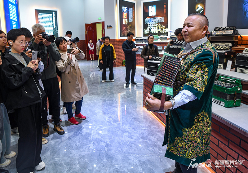 游客在塔城手風(fēng)琴博物館聆聽手風(fēng)琴演奏。天山網(wǎng)-新疆日報(bào)記者 周鵬攝