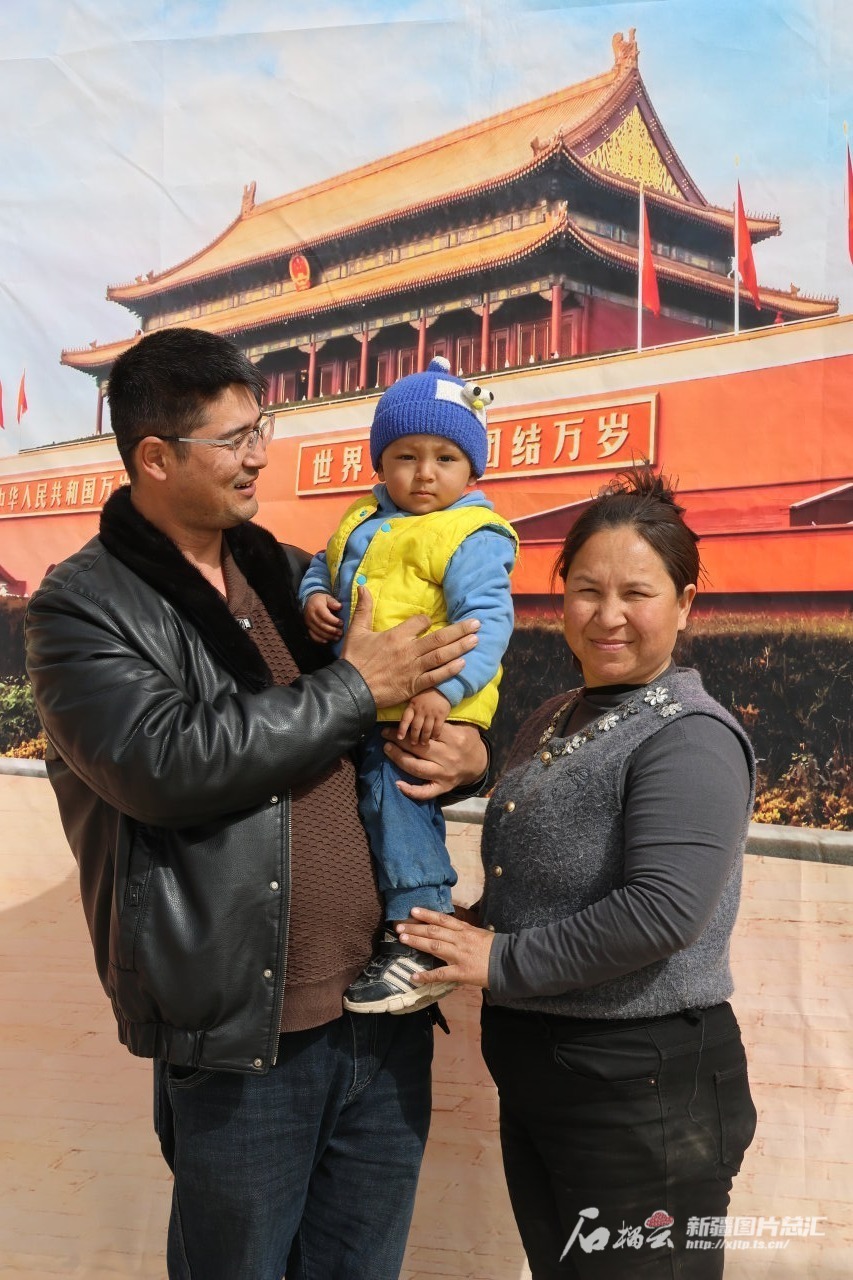 3月24日下午,和田縣阿瓦提鄉(xiāng)阿克恰勒村,胡春芳拍攝的奧布力卡斯木·麥提庫爾班一家三口在天安門照片背景前的合影。胡春芳供圖