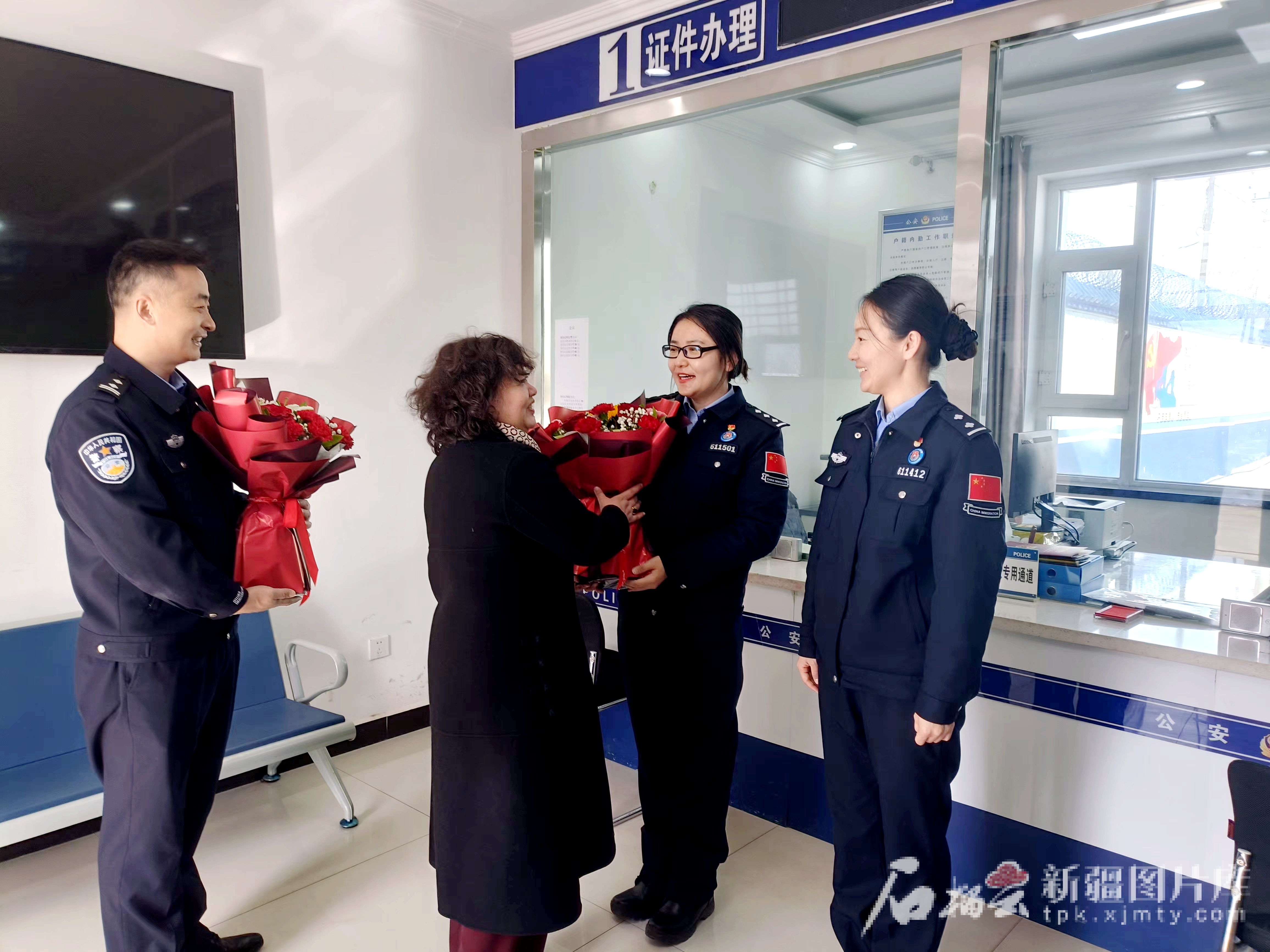 今年“三八”節(jié),伊犁邊境管理支隊(duì)洪納海邊境派出所戶籍民警哈爾麗哈西(右二)和趙文靜(右一)受到慰問。王鵬飛 攝