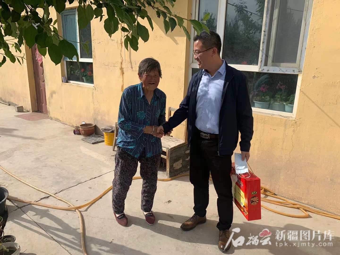 2021年,劉志兵(右)在廈門援建的吉木薩爾縣一家養(yǎng)老院看望老人。受訪者供圖