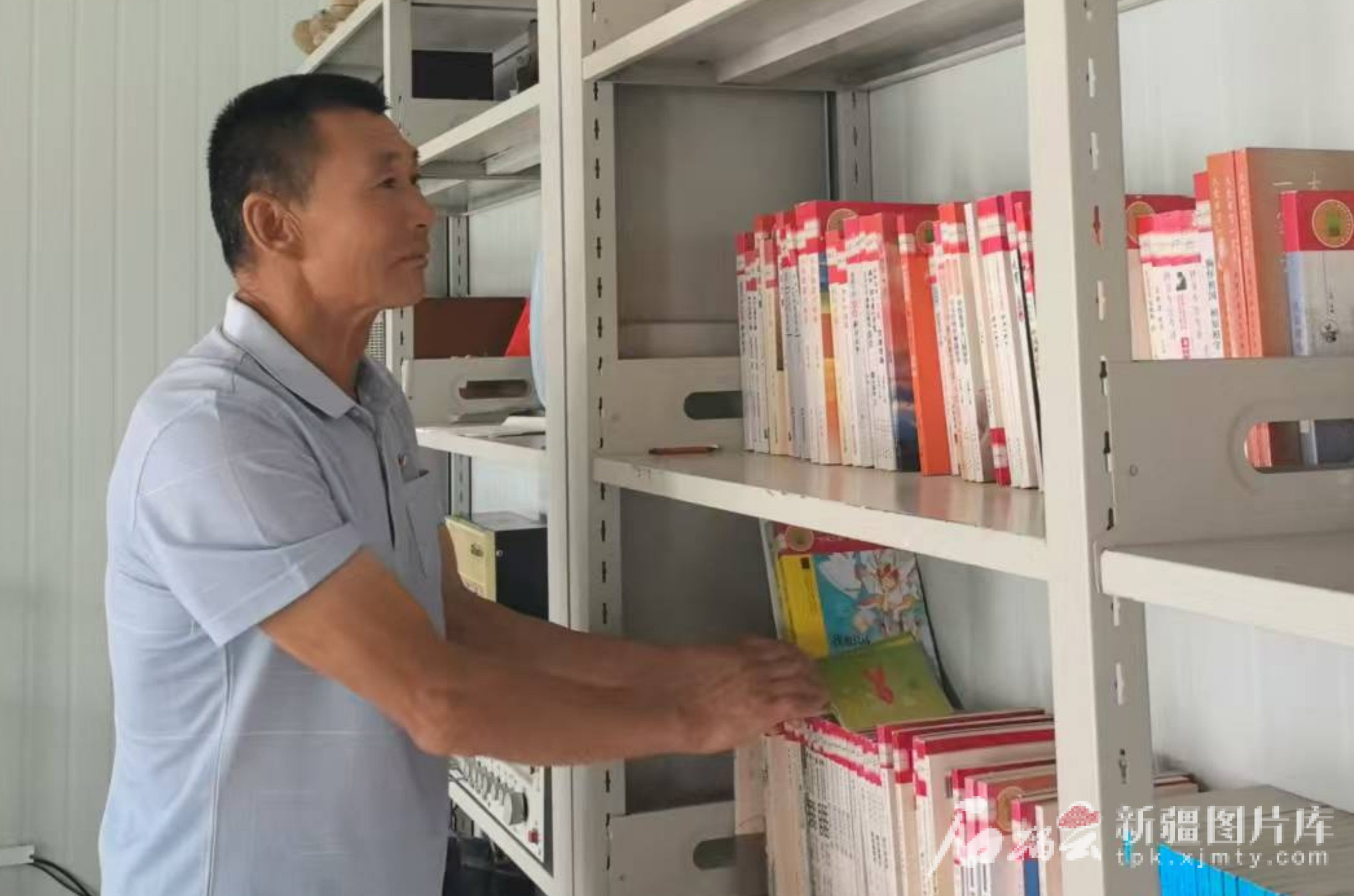 2014年開始,蔣業(yè)祿的家成為村里的文化大院,村民們經(jīng)常在這里開展文化活動(dòng),排練擁軍節(jié)目。這是7月6日,蔣業(yè)祿在家中整理書籍。天山網(wǎng)-新疆日報(bào)記者 魏永貴攝