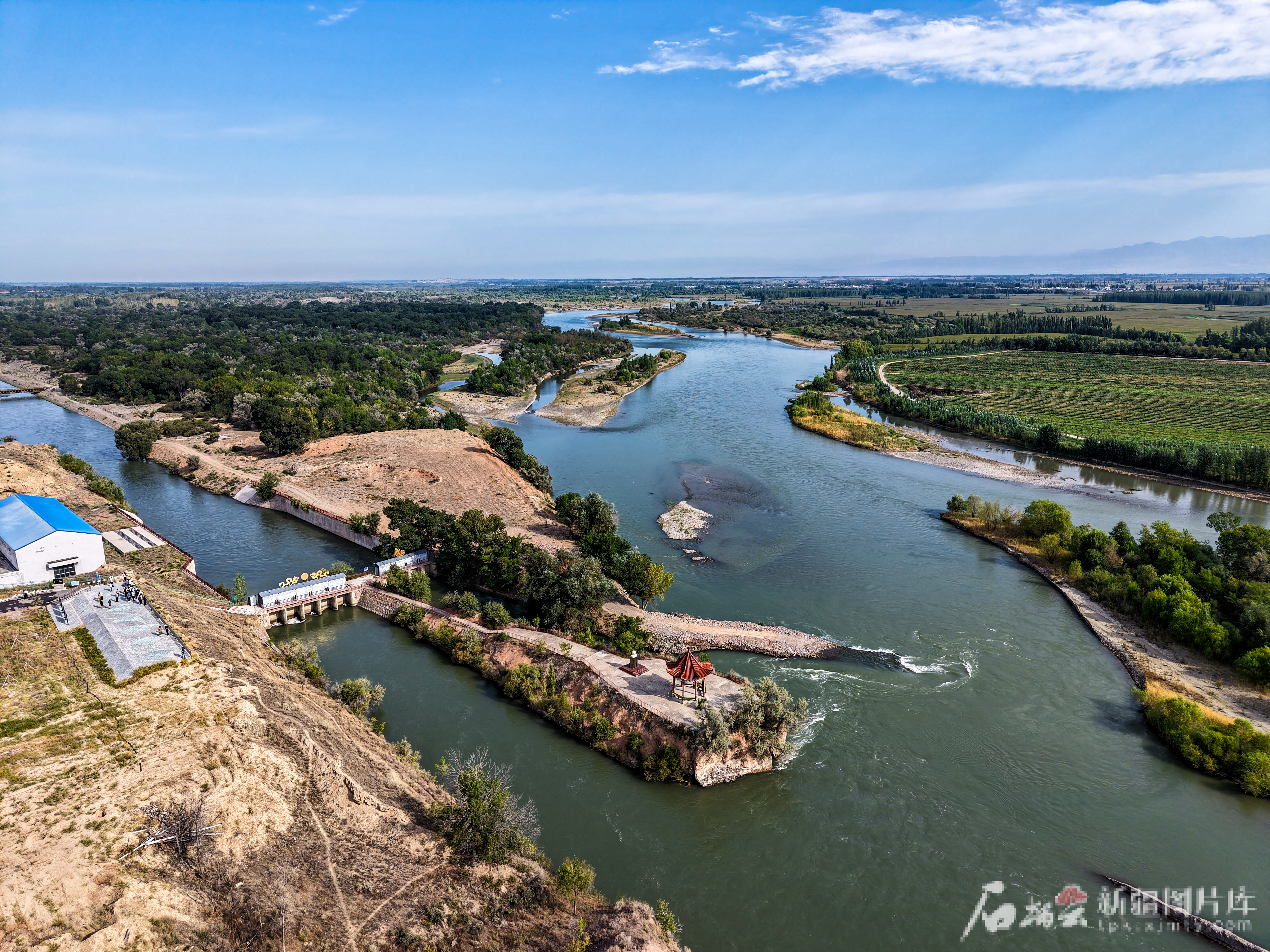 位于察布查爾錫伯自治縣境內(nèi)的察布查爾大渠老龍口(8月8日無人機攝)。