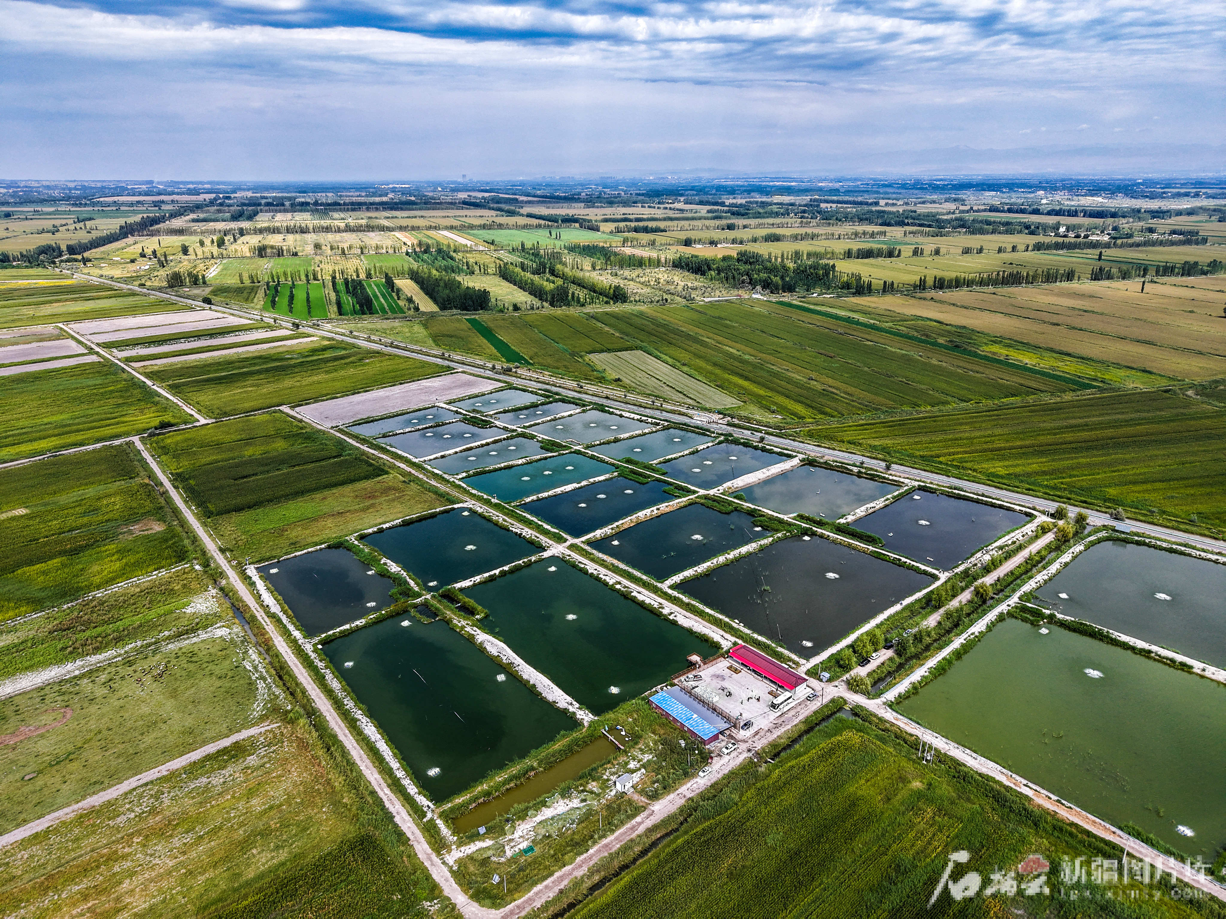 8月8日,鳥瞰察布查爾錫伯自治縣坎鄉(xiāng)稻蟹養(yǎng)殖基地。(無人機攝)
