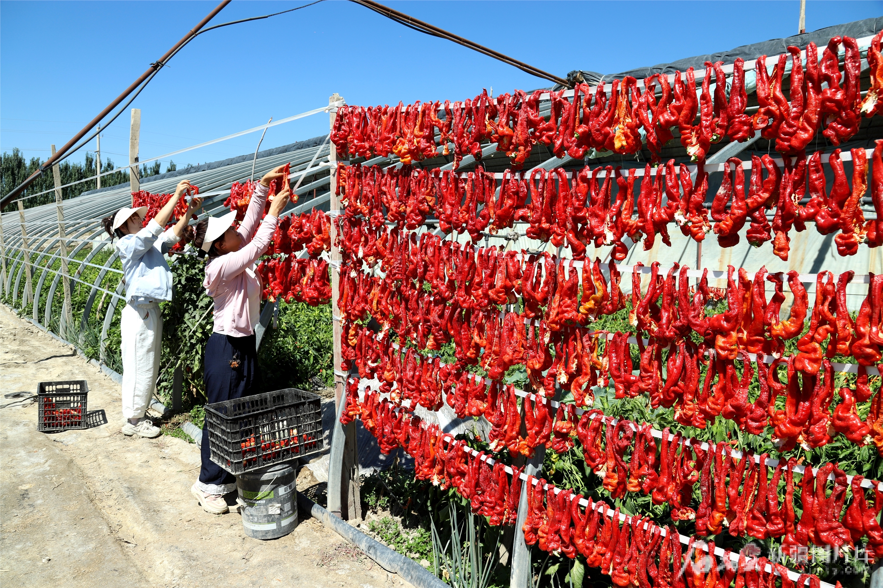 8月7日,職工在兵團(tuán)二師22團(tuán)10連溫室大棚旁晾曬鮮食辣椒。連日來,當(dāng)?shù)胤N植戶搶抓晴好天氣,組織人員采摘、晾曬辣椒,確保今年有個(gè)好收成。謝江林?jǐn)z