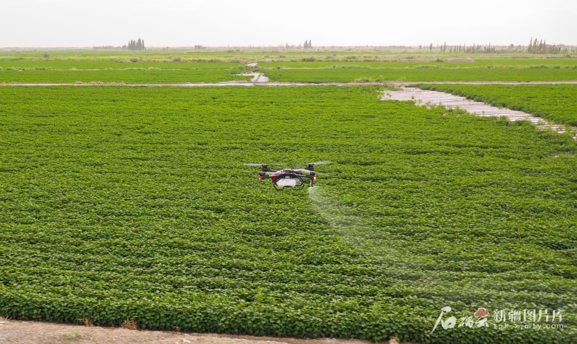 盛夏時(shí)節(jié),尉犁縣“超級(jí)棉田”上空,無人機(jī)正在打藥。圖片由艾海鵬提供