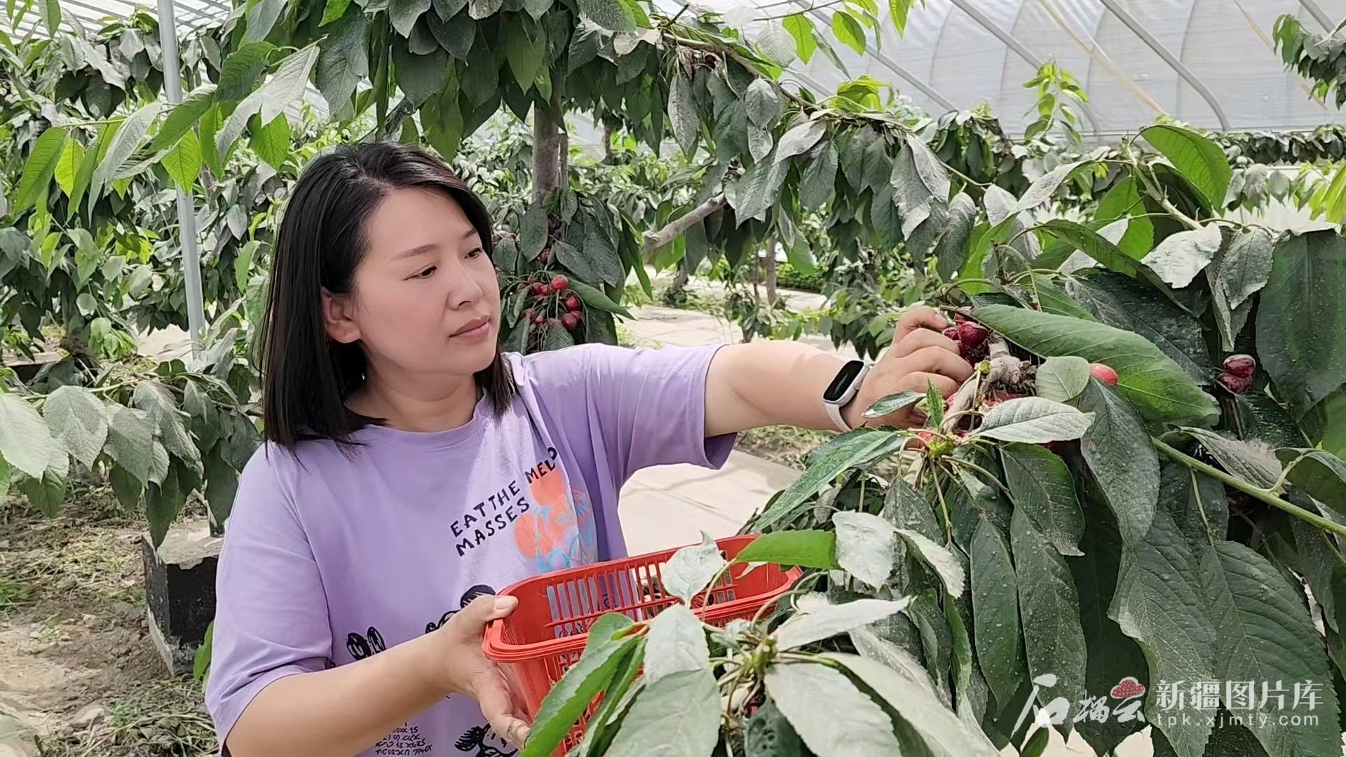 今年櫻桃上市時(shí),庫爾勒市種植戶田杜娟在櫻桃園體驗(yàn)采摘的快樂。圖片由田杜娟提供