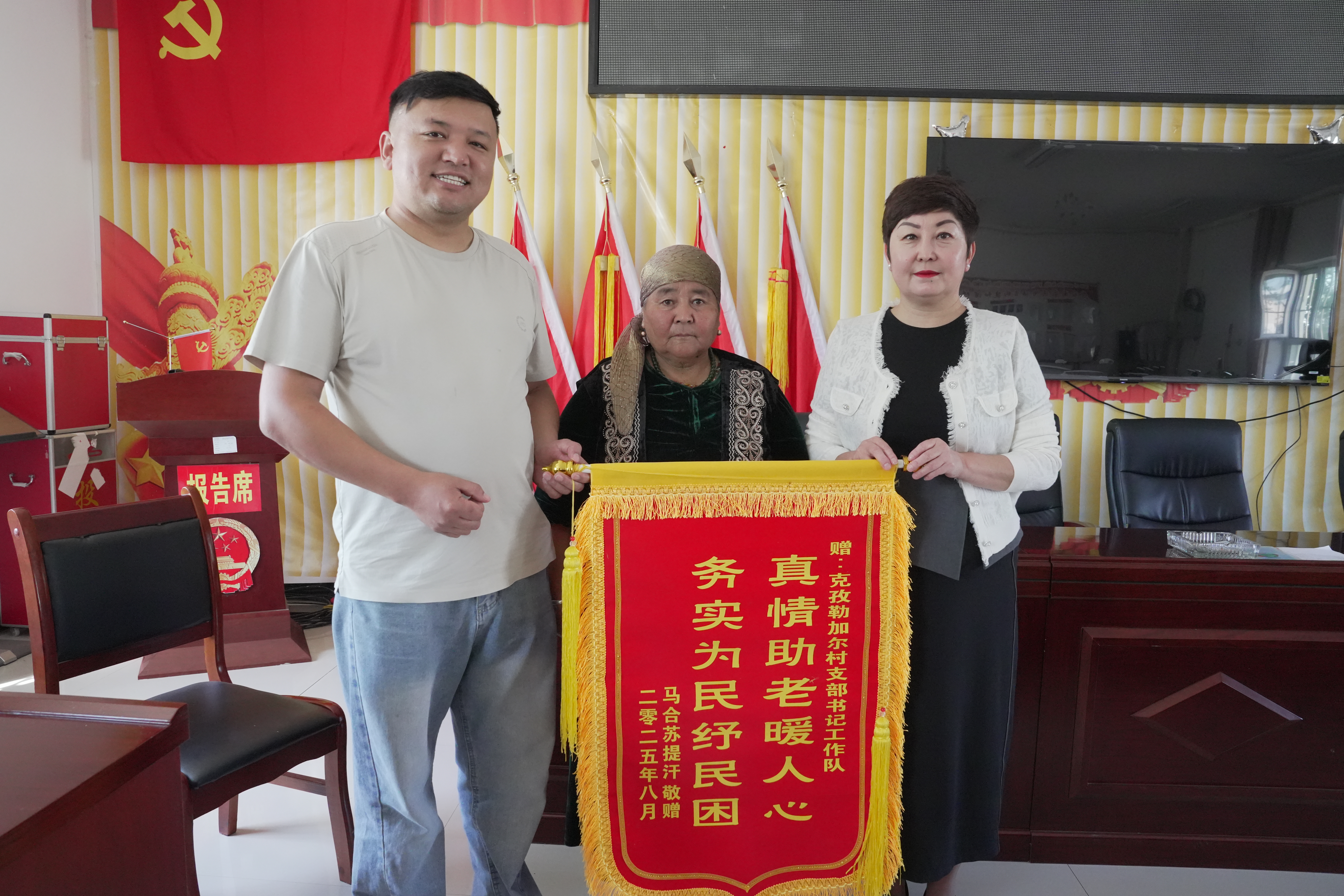 在吉木乃縣烏拉斯特鎮(zhèn)克孜勒加爾村,一場溫暖的錦旗傳遞儀式于8月25日悄然進(jìn)行。年邁的娜孜依拉·阿哈太奶奶邁著緩慢而堅(jiān)定的步伐,將一面精心準(zhǔn)備的錦旗交到村“兩委”和駐村工作隊(duì)隊(duì)員手中,布滿皺紋的臉上洋溢著幸福的笑容。