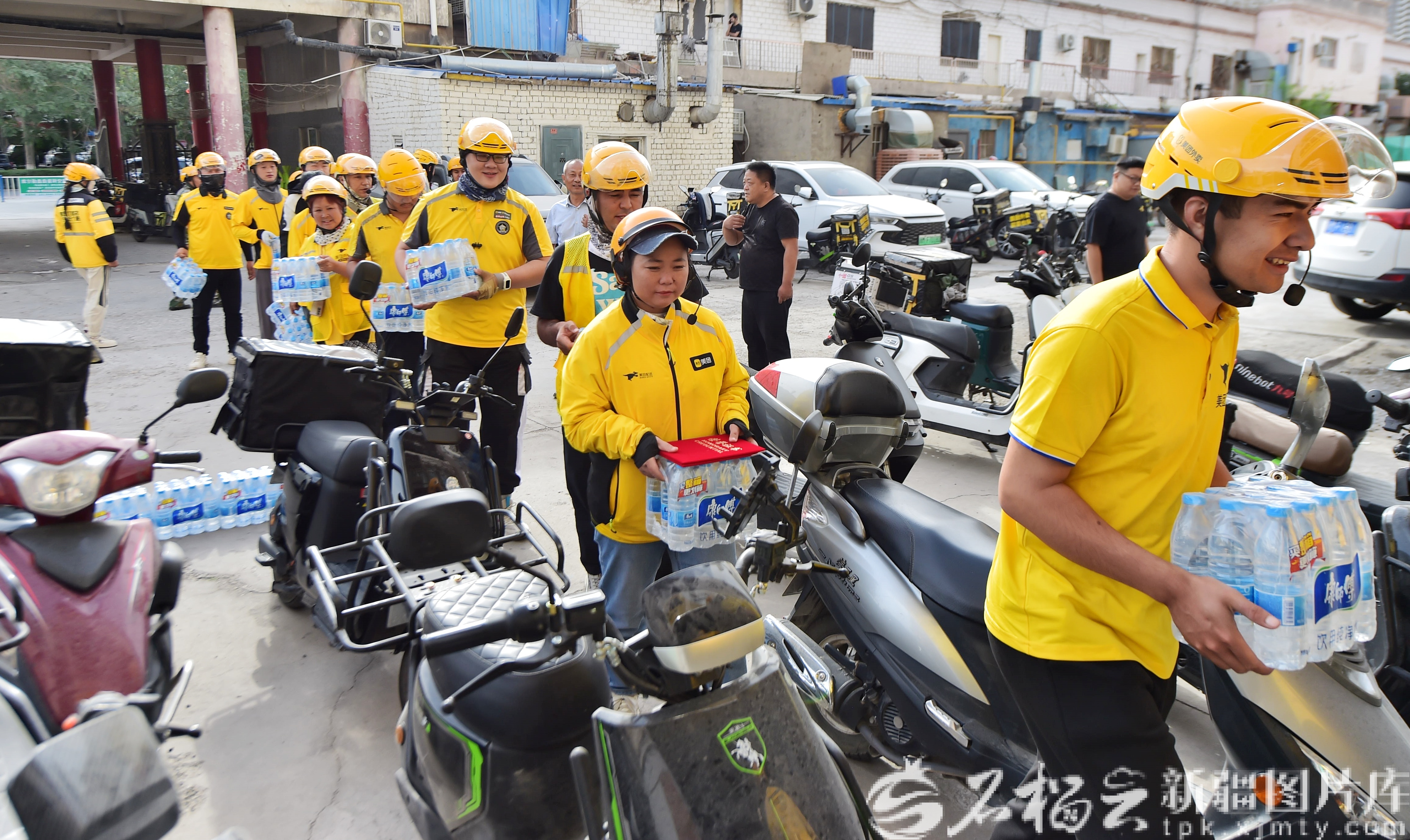 9月4日,外賣騎手抱著社區(qū)免費(fèi)送的礦泉水。天山網(wǎng)-新疆日報(bào)訊記者 王立華攝