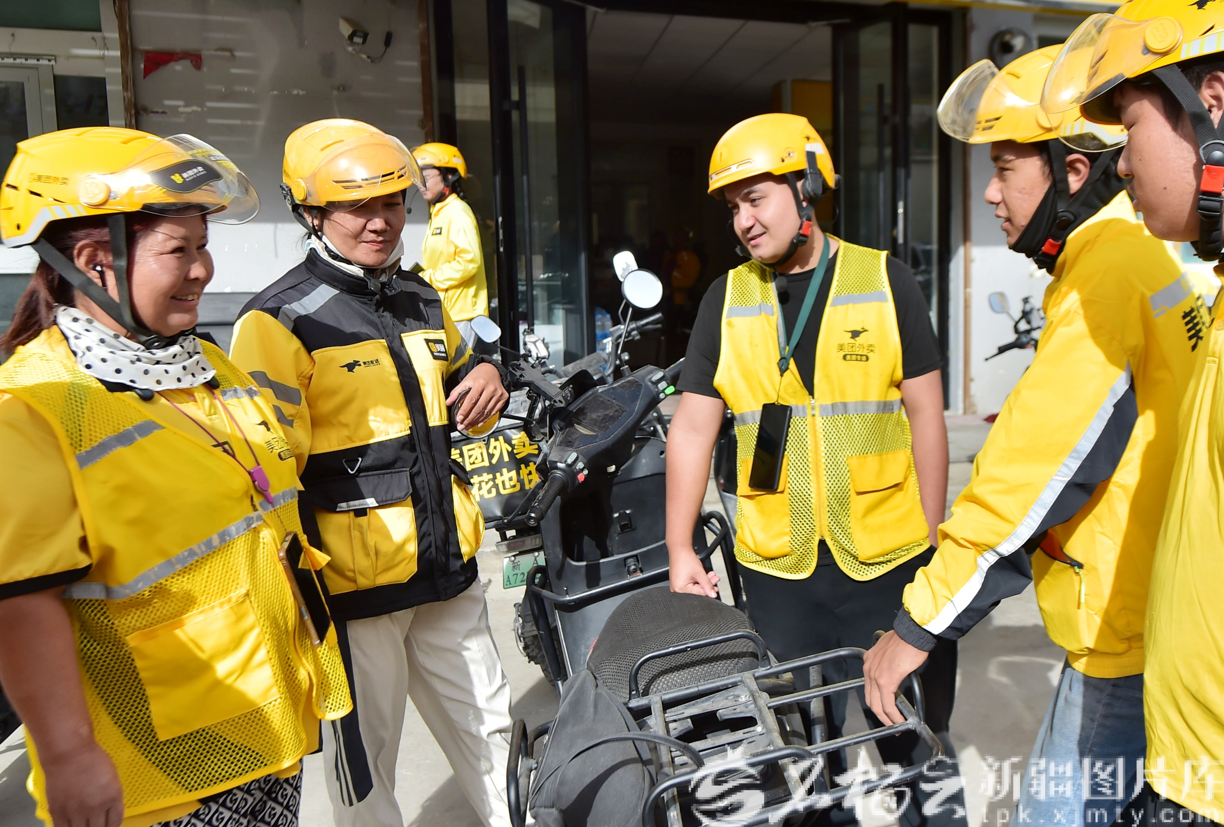 9月4日,獲獎(jiǎng)的外賣騎手在愉快交流。天山網(wǎng)-新疆日報(bào)訊記者 王立華攝