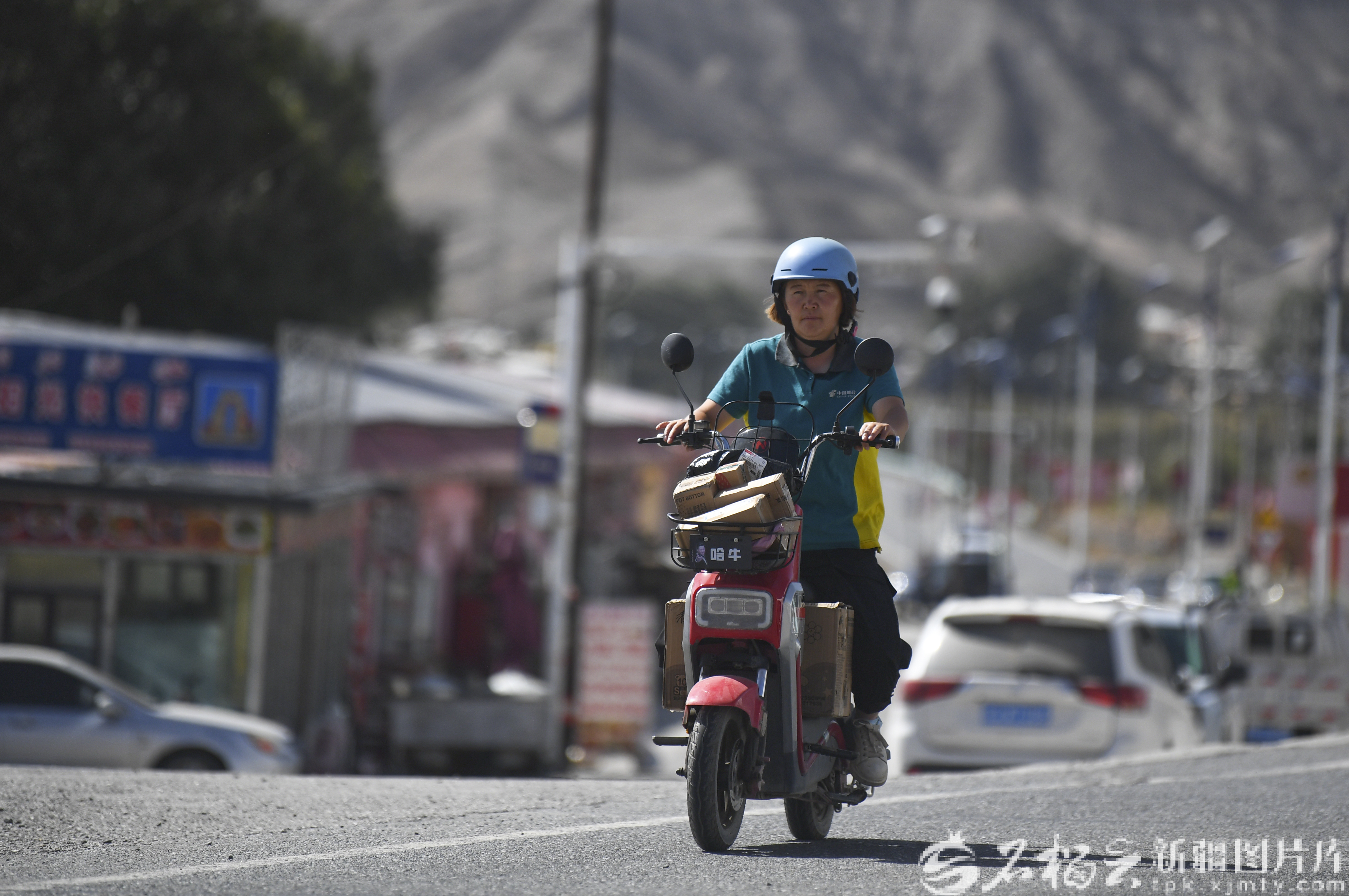 9月13日,伊熱斯比·圖爾迪馬買提騎著電動車行駛在投遞快遞的路上。