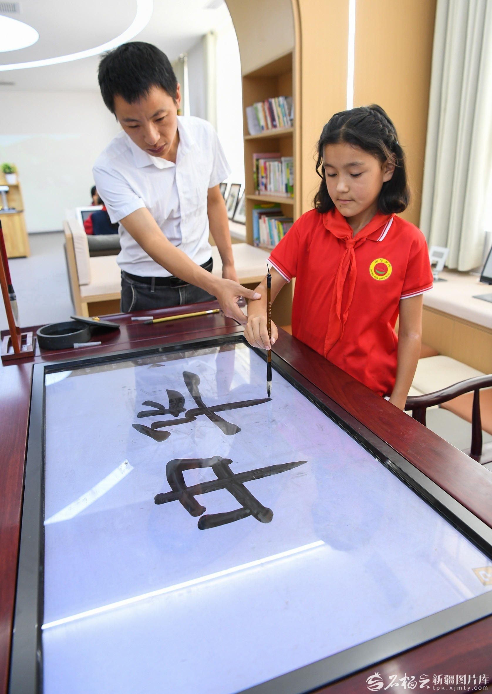 9月19日,疏附縣托克扎克鎮(zhèn)中心小學(xué)學(xué)生援疆教師的指導(dǎo)下學(xué)習(xí)書(shū)法。