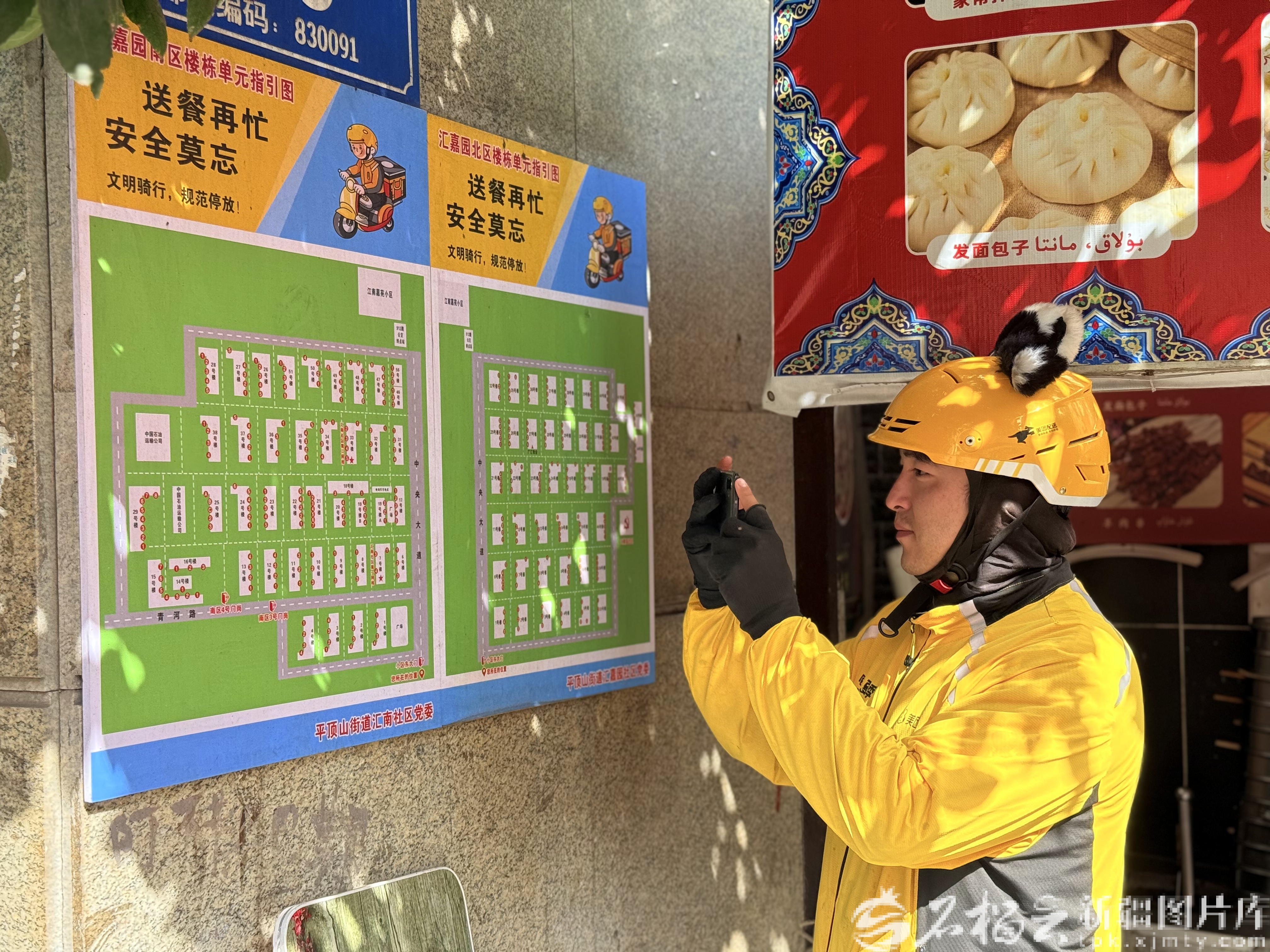 9月21日,烏魯木齊市沙依巴克區(qū)平頂山街道匯嘉園小區(qū)門(mén)口,外賣(mài)騎手正在拍小區(qū)俯視圖,方便送餐使用。天山網(wǎng)-新疆日?qǐng)?bào)記者 孫芳婷攝
