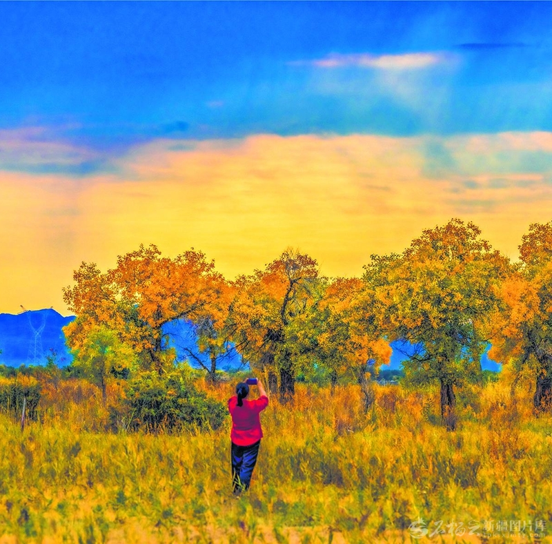 9月17日,游客在克拉瑪依市烏爾禾區(qū)白楊河胡楊林拍攝。傍晚,金色云霞給胡楊林披上了一層夢幻的光彩,吸引著眾多游客前來觀賞。 □田國建攝
