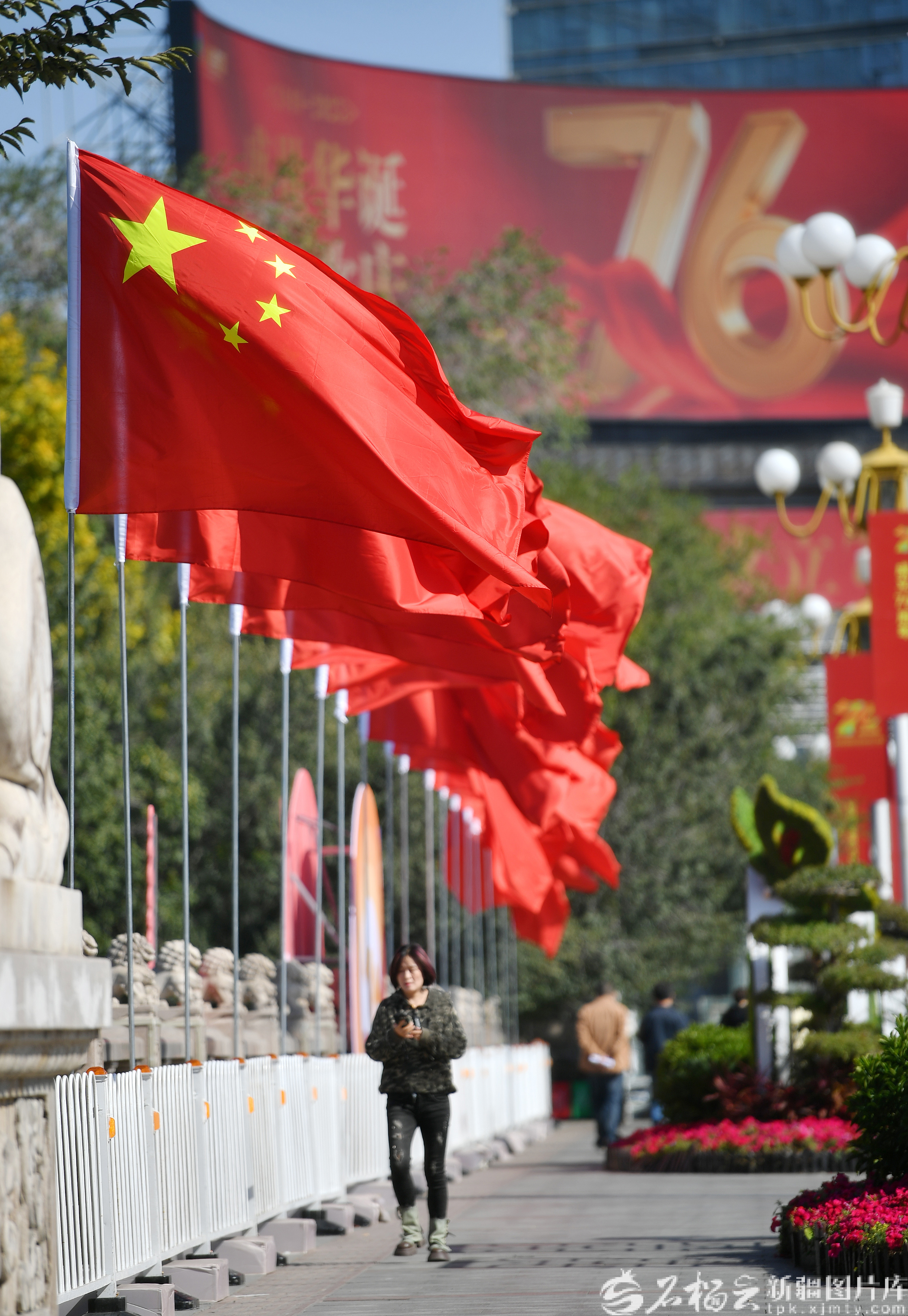 9月29日,市民走過紅旗招展的烏魯木齊市西大橋。