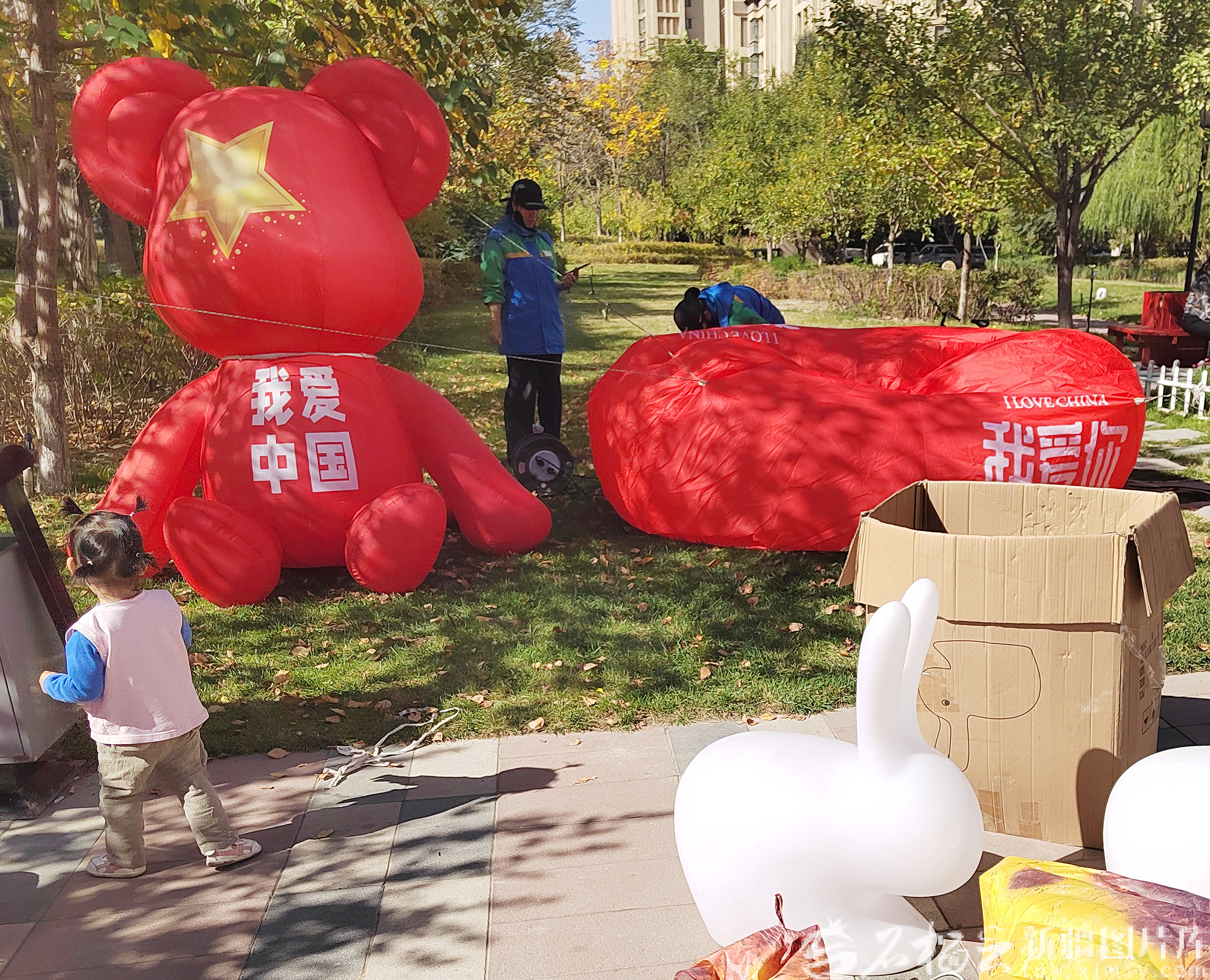 9月29日,工作人員在烏魯木齊市河南路一處小區(qū)安裝卡通形象,營造國慶節(jié)、中秋節(jié)喜慶氛圍。