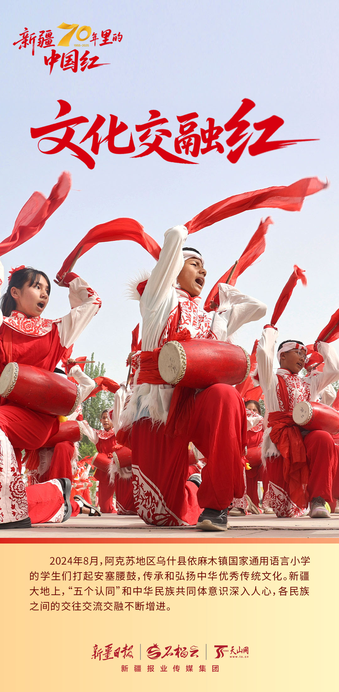 70年昂揚(yáng)奮進(jìn),從豐收盛景到絲路虹光,從科技燎原到文化共融,新疆以跨越之姿繪就的盛世長(zhǎng)卷上,每一寸都浸染著“中國(guó)紅”的熾熱圖騰。