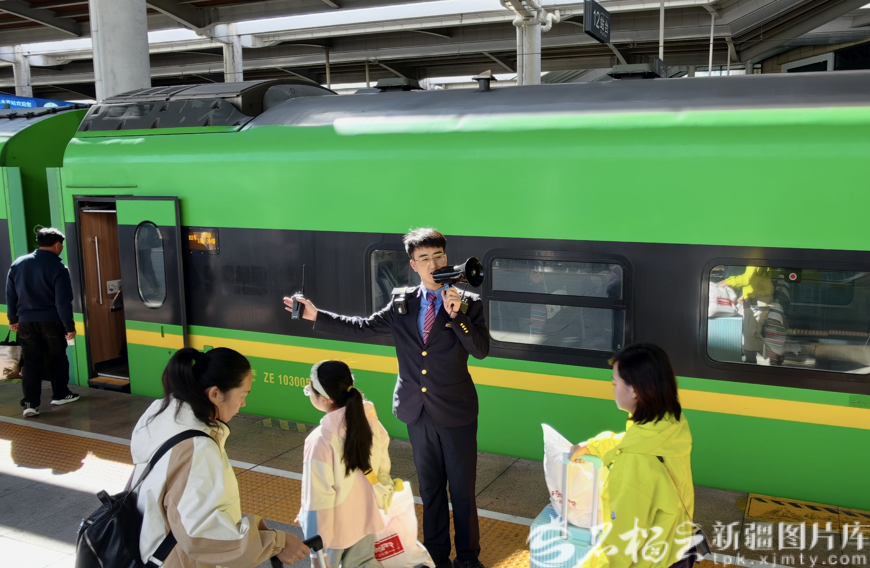 10月3日,一名工作人員在烏魯木齊站站臺前疏導旅客。