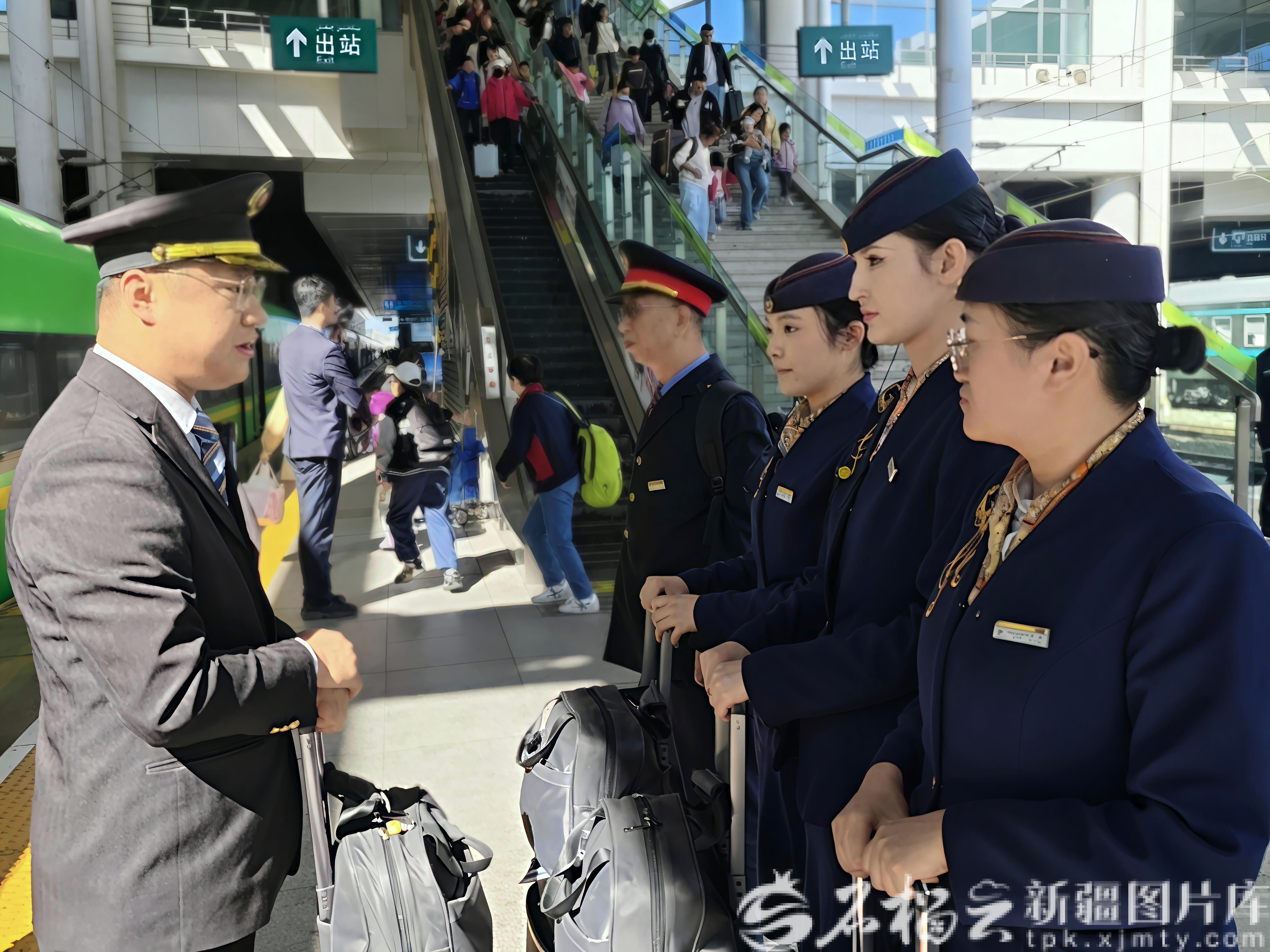 10月3日,在烏魯木齊站,即將出發(fā)的火車服務車組在做出發(fā)前準備。