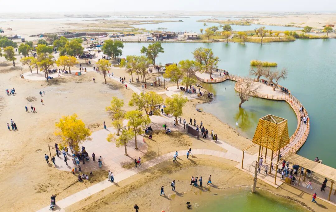 經(jīng)過4個月的改造,羅布人村寨景區(qū)全新打造了“絲路巴扎”,匯聚非遺展示、民俗體驗(yàn)、“胡楊系列”文創(chuàng)及特色美食,重現(xiàn)古絲路商貿(mào)繁華;沉浸式歌舞表演更讓游客在胡楊、沙漠與湖泊間,領(lǐng)略深厚的歷史文化和人文之美。雙節(jié)假期,該景區(qū)接待游客8.35萬人次,同比增長16.31%。