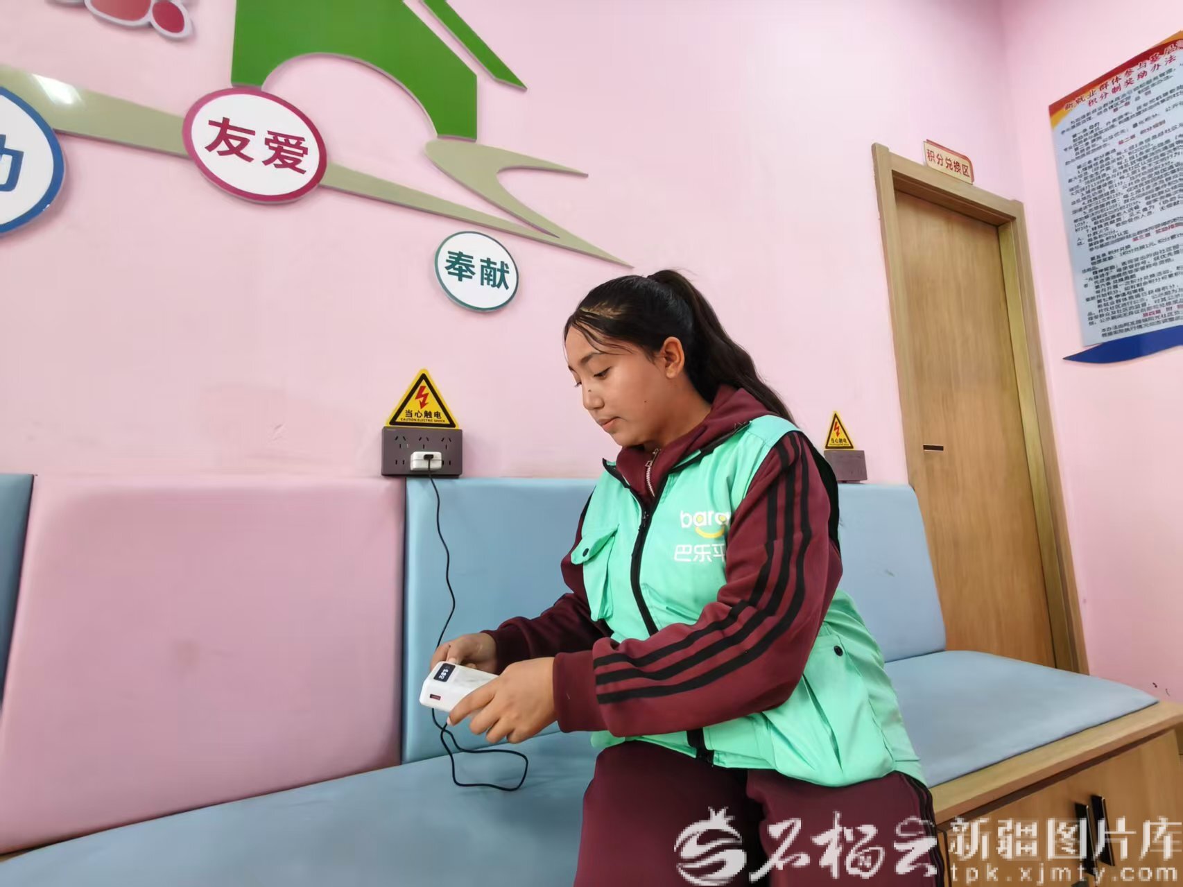 工作間隙,外賣員熱西代·亞生在“愛新驛站”給充電寶充電。天山網(wǎng)-新疆日?qǐng)?bào)記者 張治立 攝