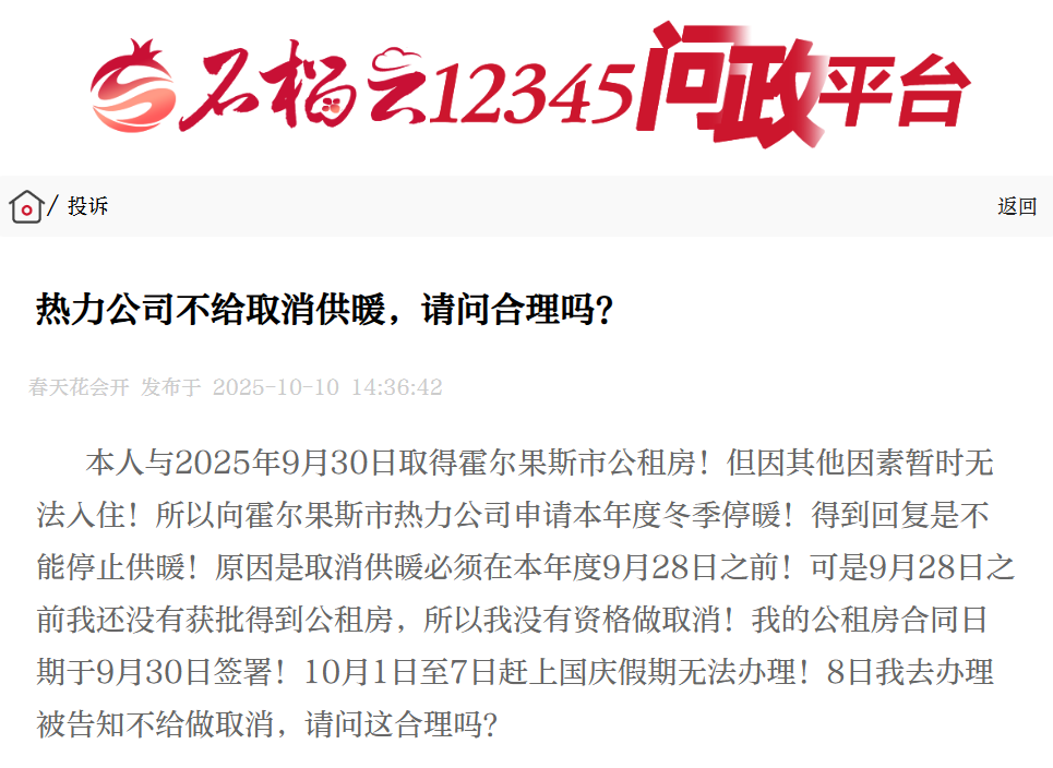 天山網(wǎng)-新疆日報訊(記者李娜報道)“申請了公租房但暫時無法入住,向熱力公司申請停暖,得到的回復(fù)是不能停止供暖。請問這合理嗎?”近日,霍爾果斯市網(wǎng)友麻先生在石榴云12345問政平臺反映了他的困擾,希望當(dāng)?shù)毓峁灸芙o出相應(yīng)解釋。