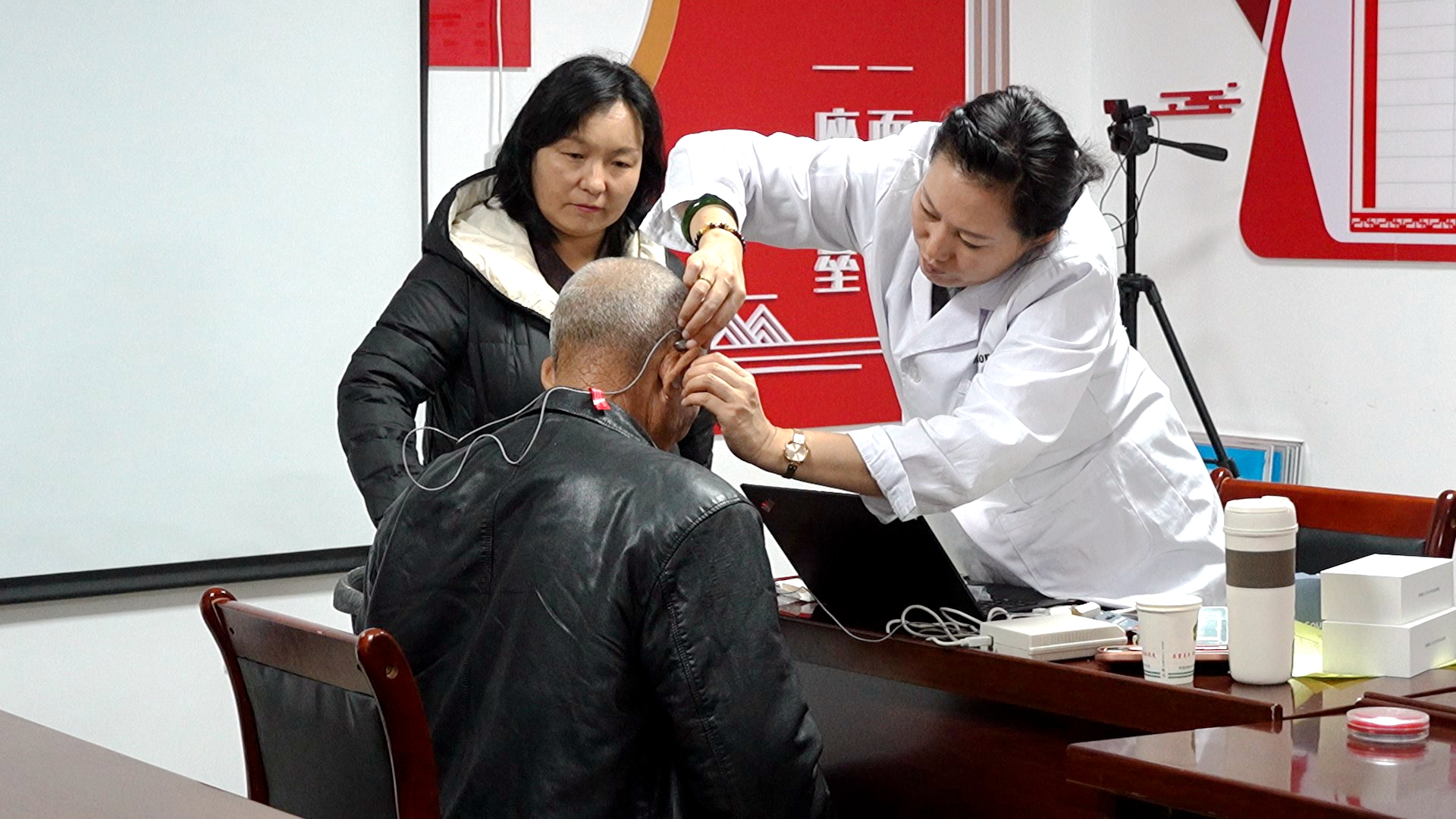 醫(yī)務(wù)人員現(xiàn)場為聽力障礙患者調(diào)試助聽器。