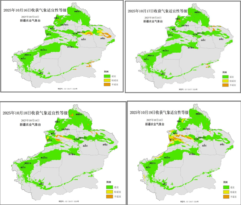 10月16—19日收獲氣象適宜性等級(jí)預(yù)報(bào)。新疆農(nóng)業(yè)氣象臺(tái)供圖