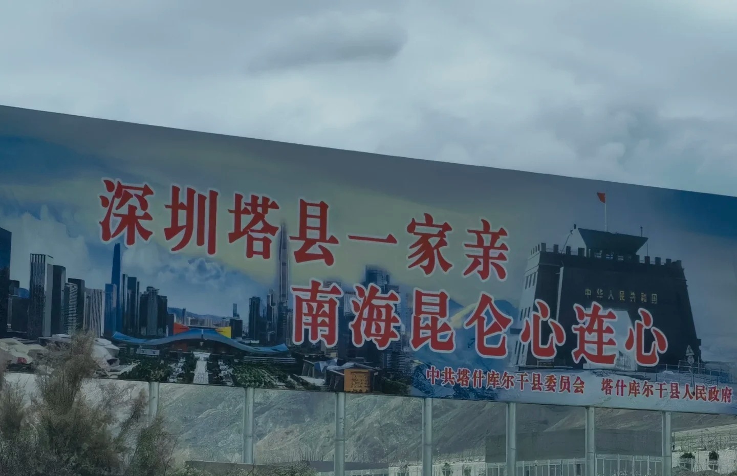 此前,網(wǎng)友在新疆自駕,從塔什庫爾干塔吉克自治縣回阿克陶的路上拍攝到“感謝黨中央的親切關(guān)懷,感謝廣東深圳市的無私援助”的路牌。