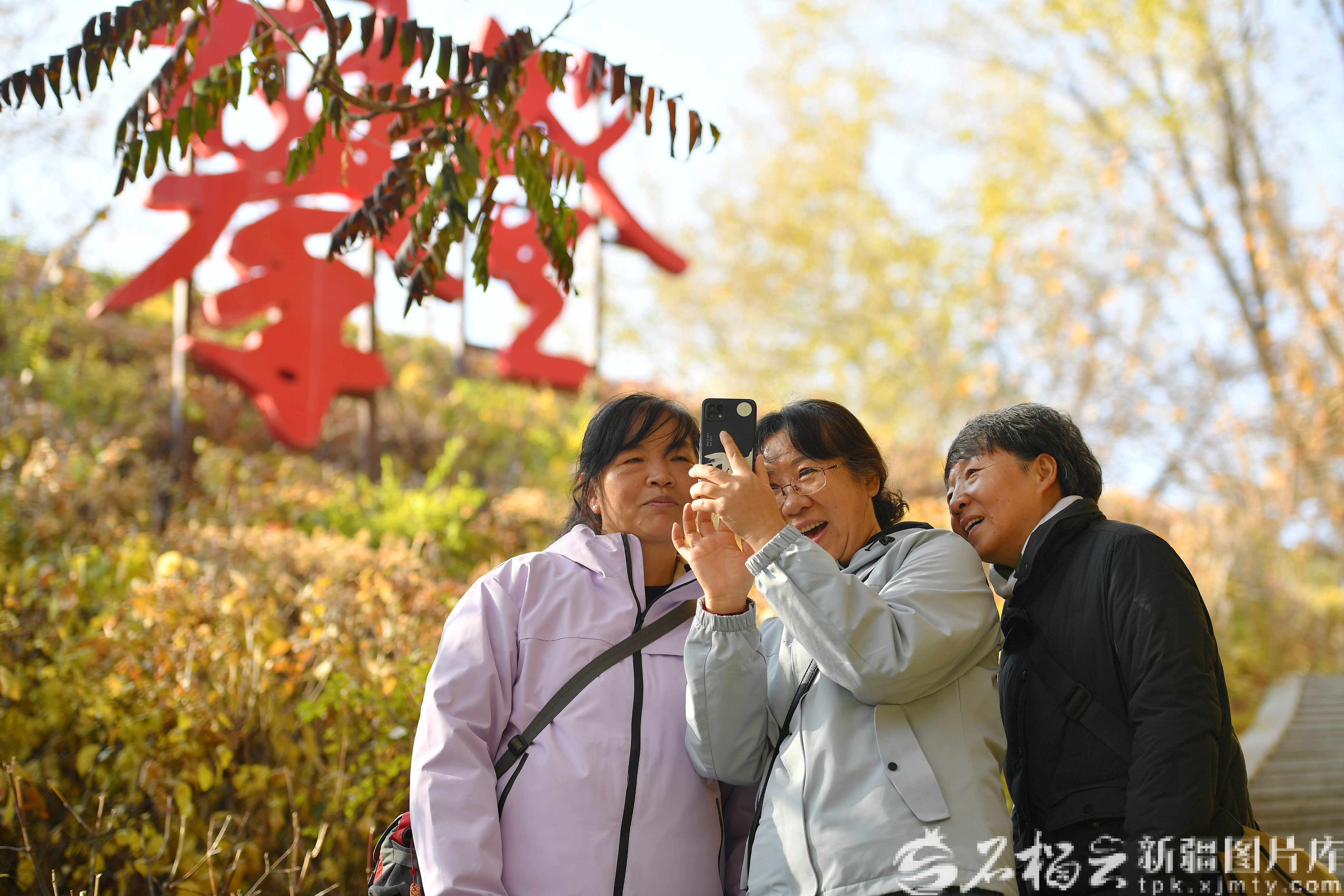 10月28日,市民在烏魯木齊市雅瑪里克山登山之余拍照、分享。