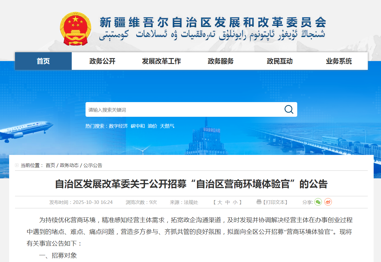 10月30日,自治區(qū)發(fā)展和改革委員會網(wǎng)站發(fā)布招募公告,面向社會公開招募100名“自治區(qū)營商環(huán)境體驗官”。