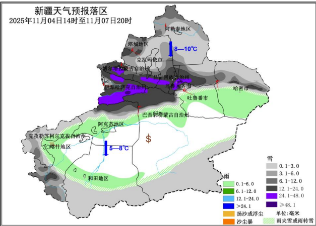 預(yù)報顯示,11月4日午后至7日白天,北疆各地、東疆大部和南疆西部、巴音郭楞蒙古自治州等地部分區(qū)域有小雨或雨夾雪轉(zhuǎn)雪,其中伊犁河谷、博爾塔拉蒙古自治州、塔城地區(qū)、烏魯木齊市、昌吉回族自治州、喀什地區(qū)南部山區(qū)等地的部分區(qū)域暴雪,上述局地有大暴雪。強(qiáng)降雪時段:伊犁河谷、博州、塔城地區(qū)在4日夜間至5日夜間,烏魯木齊市、昌吉州、阿克蘇地區(qū)北部山區(qū)在5日白天至夜間,巴州北部山區(qū)在5日白天至6日白天,哈密市北部山區(qū)在6日白天至夜間。