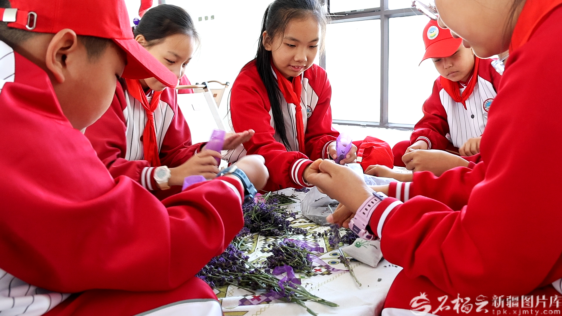 10月25日,在霍城縣蘆草溝鎮(zhèn)漫心忘憂谷景區(qū),來自特克斯縣參加研學(xué)的學(xué)生在制作薰衣草香囊。圖/新疆漫心忘憂谷文化旅游發(fā)展有限公司提供
