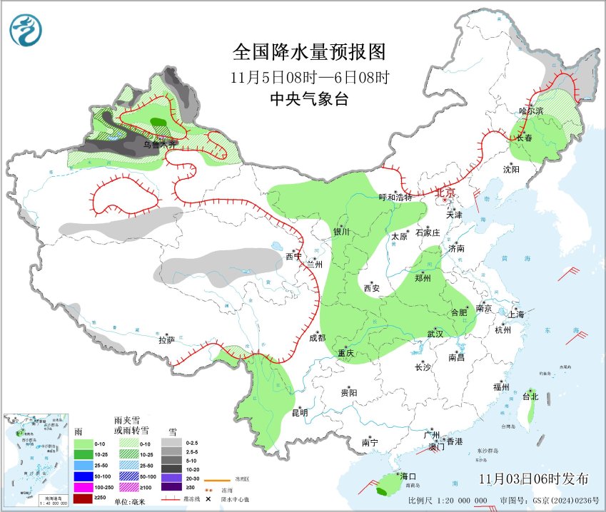 11月5日8時(shí)至6日8時(shí)全國(guó)降水量預(yù)報(bào)圖。圖/中央氣象臺(tái)