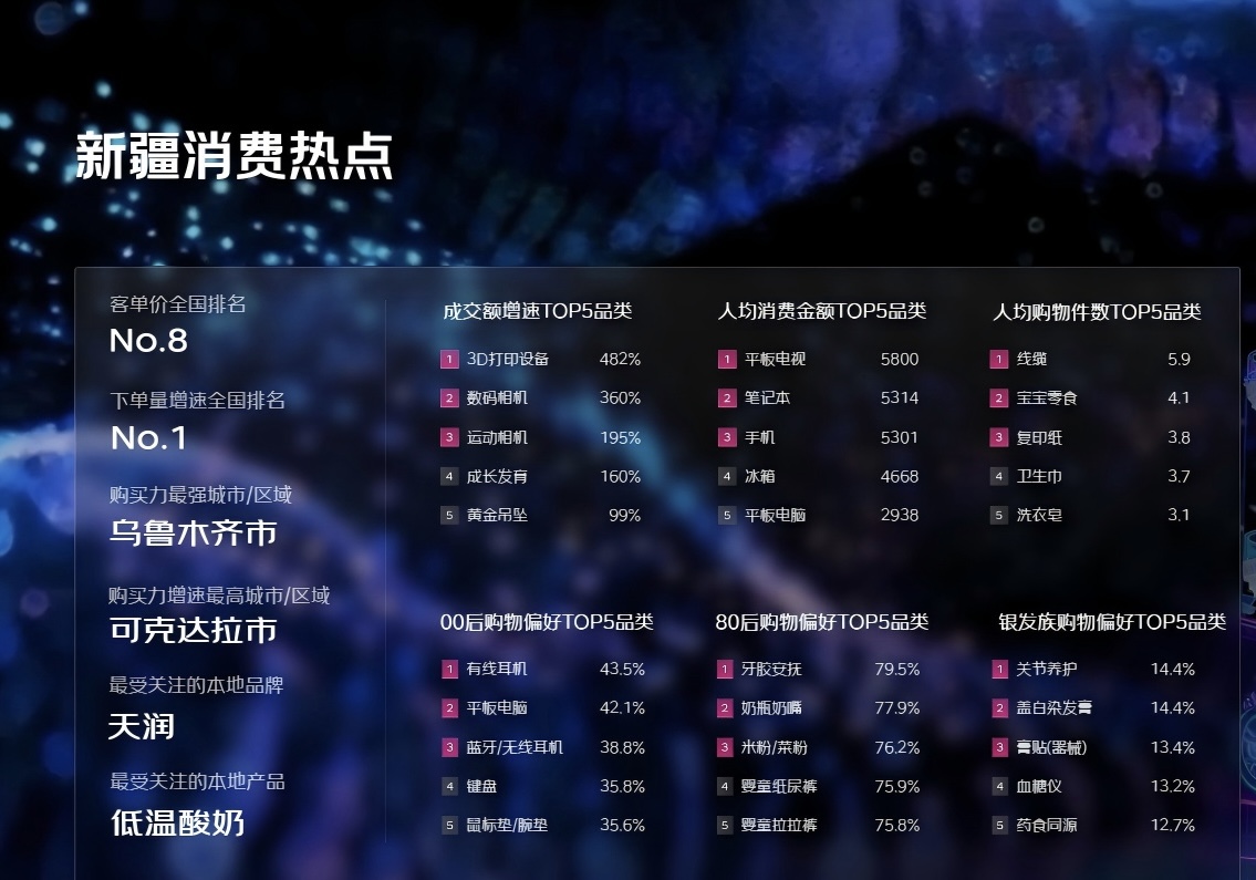 京東消費及產(chǎn)業(yè)發(fā)展研究院高級研究員楊亞茹分析認為,今年細分品類的表現(xiàn),藏著新疆消費者的生活智慧。在成交額增速領先的品類里,3D打印設備(482%)、數(shù)碼相機(360%)、運動相機(195%)盡顯對科技與探索的熱愛,黃金吊墜(99%)則透著對品質(zhì)生活的追求,而“成長發(fā)育”類產(chǎn)品的高增速(160%),也反映出對家庭與成長的關(guān)注。