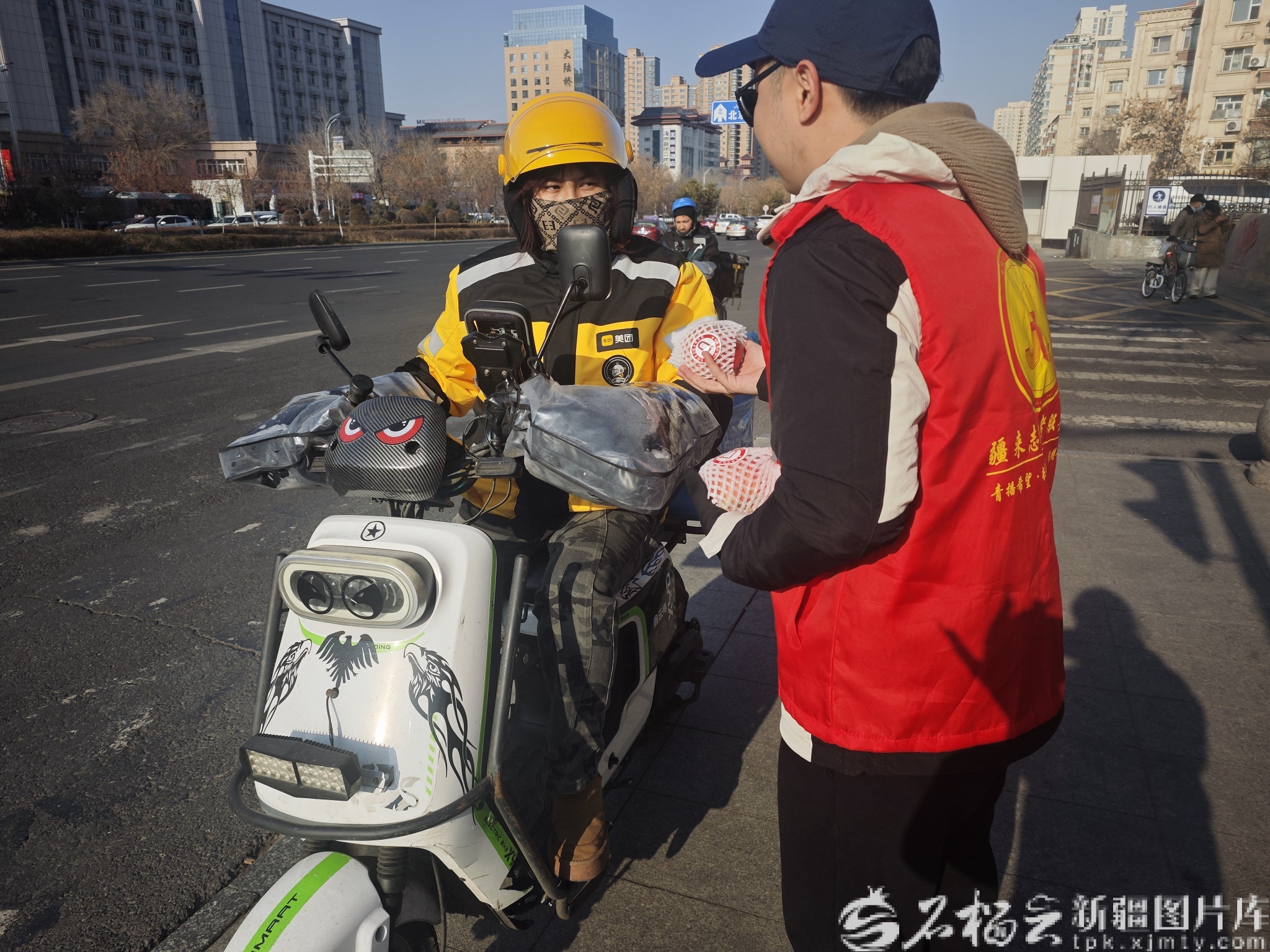 志愿者為快遞小哥送蘋果。邢翔宇 攝