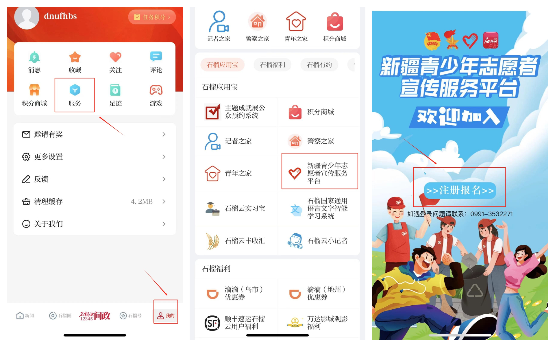 新疆青少年志愿者宣傳服務平臺注冊流程:下載打開石榴云客戶端,從右下角“我的”進入“服務”,登錄“新疆青少年志愿者宣傳服務平臺”即可注冊成為志愿者。