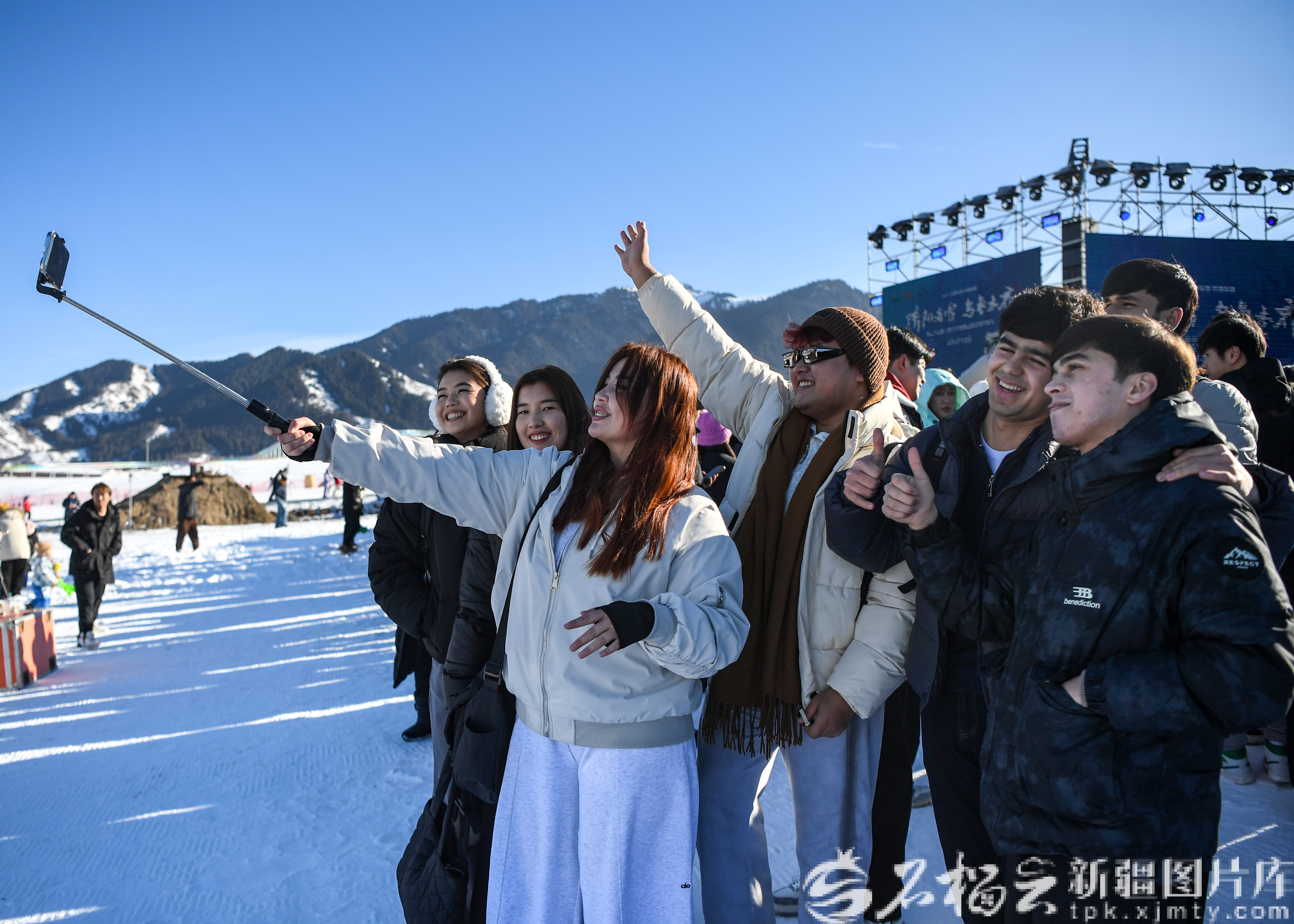 11月29日,以“驕陽看雪 烏魯木齊”為主題的第二十三屆烏魯木齊絲綢之路冰雪風(fēng)情節(jié)在絲綢之路山地度假區(qū)燃情啟幕。圖為游客在開幕式現(xiàn)場合影。
