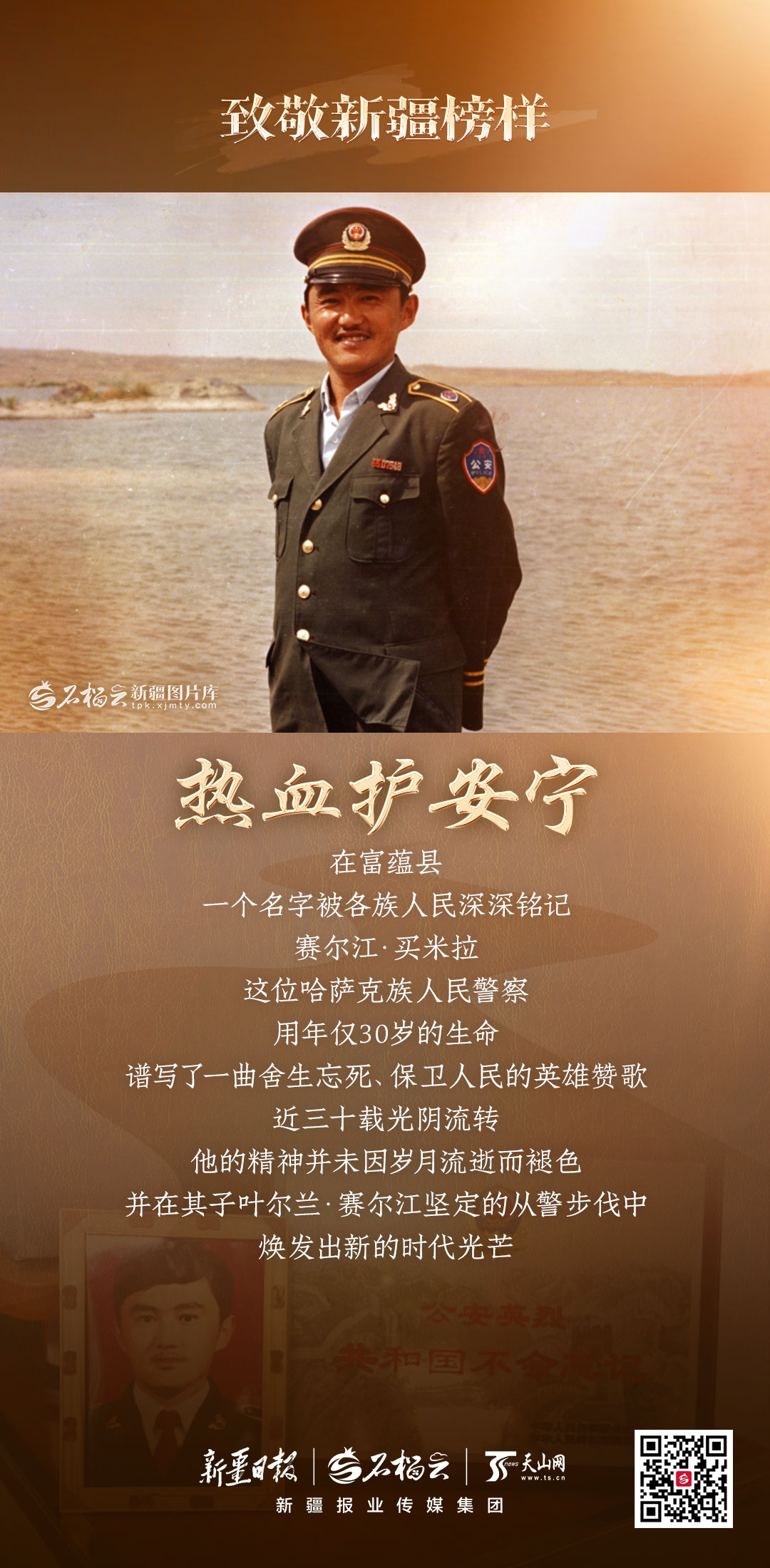 在富蘊(yùn)縣,一個(gè)名字被各族人民深深銘記——賽爾江·買(mǎi)米拉。這位哈薩克族人民警察,用年僅30歲的生命,譜寫(xiě)了一曲舍生忘死、保衛(wèi)人民的英雄贊歌。近三十載光陰流轉(zhuǎn),他的精神并未因歲月流逝而褪色,并在其子葉爾蘭·賽爾江堅(jiān)定的從警步伐中,煥發(fā)出新的時(shí)代光芒。