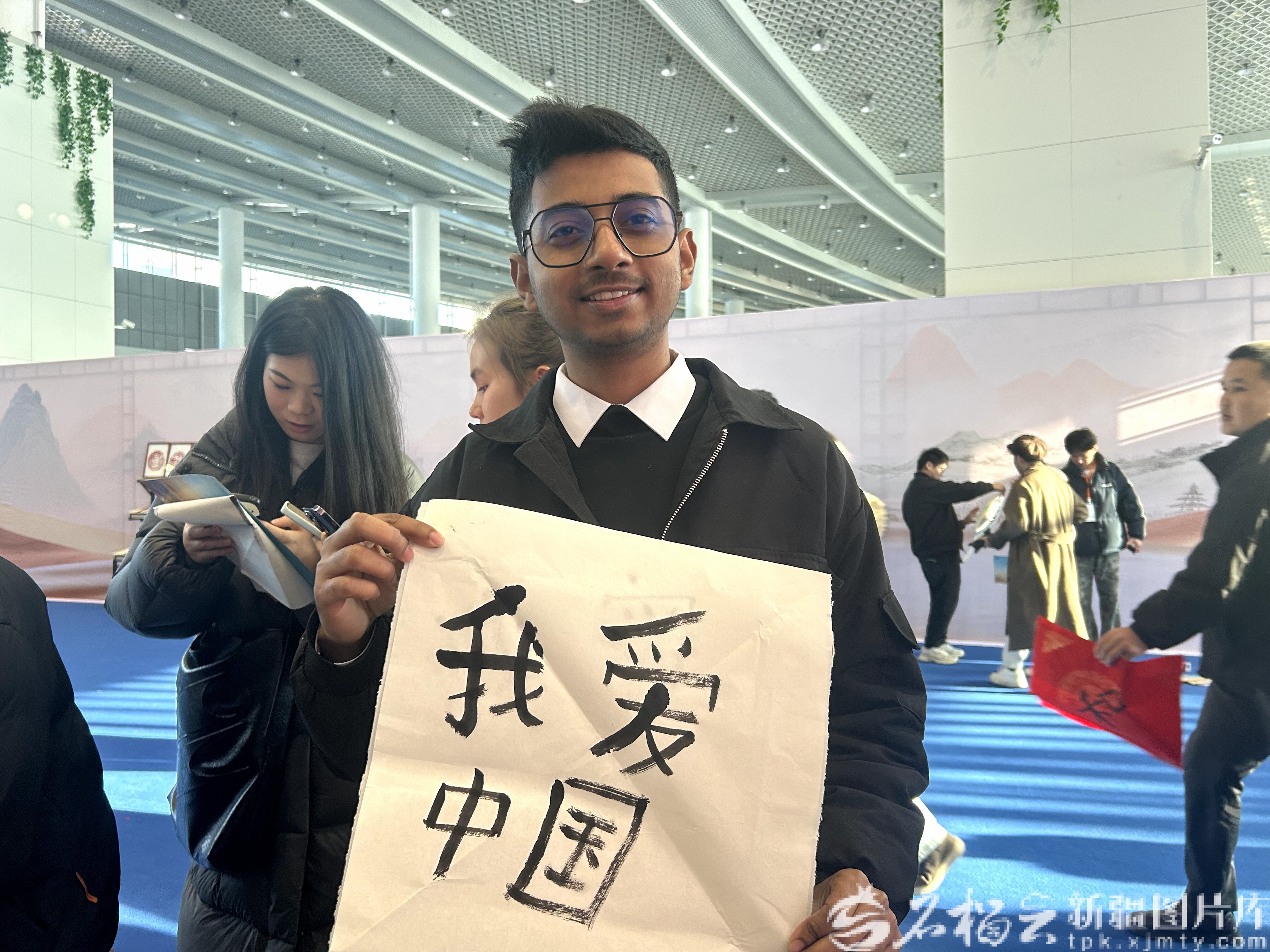 在書法展示區(qū),青年們紛紛拿起毛筆,在朱紅暗紋宣紙上用中文寫下自己的名字,看著手中的作品,大家臉上露出了開心的笑容。來自孟加拉國的梅拉杰是新疆大學(xué)留學(xué)生,他寫下了“我愛中國”四個(gè)字:“在中國留學(xué)期間,我感受到了這里的人們熱情淳樸,我深深愛上了這個(gè)國家。”