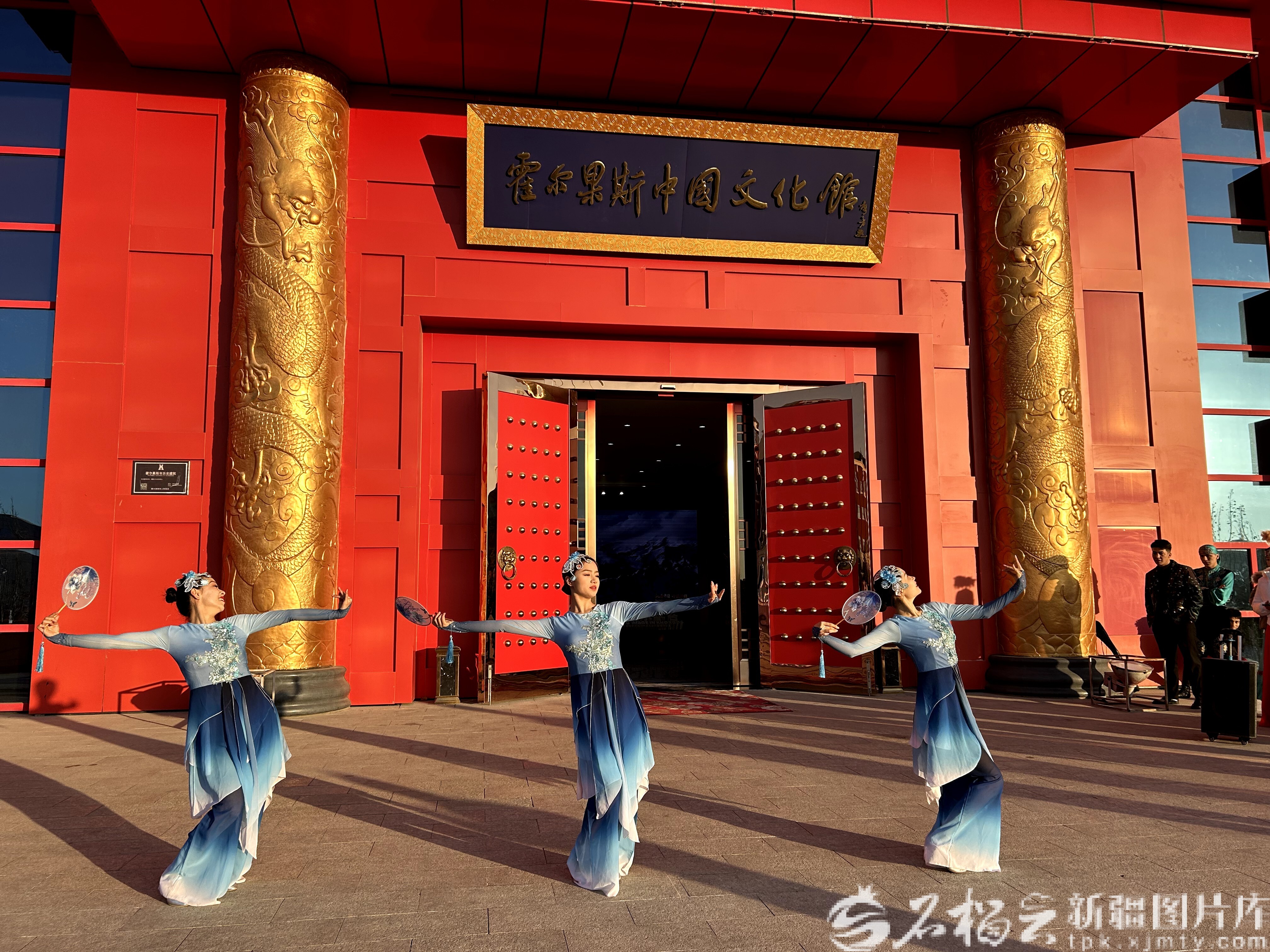 舞蹈演員在霍爾果斯中國文化館門前翩翩起舞。